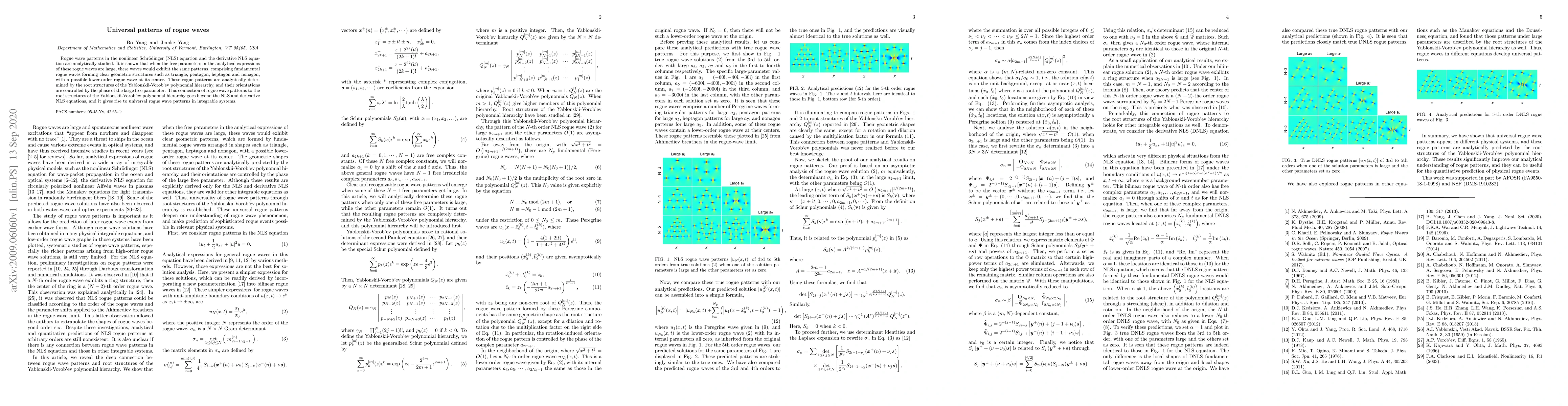This paper analyzes rogue wave patterns in nonlinear Schrödinger equations, showing they form universal geometric structures like triangles and pentagons when parameters are large. These patterns are linked to the Yablonskii-Vorob'ev polynomial hierarchy, revealing a universal behavior in integrable systems.
