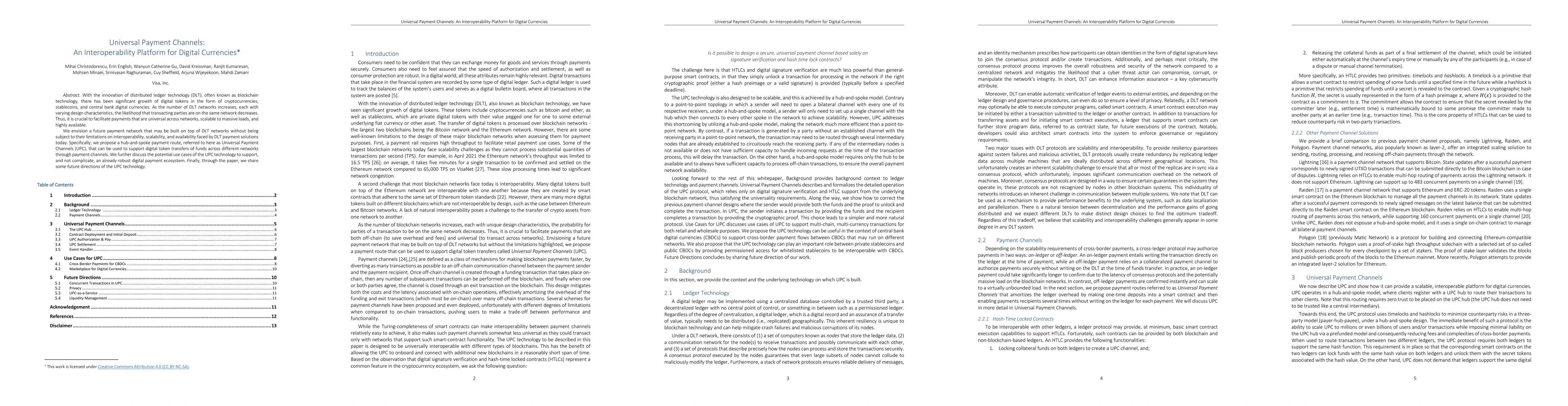 This paper proposes Universal Payment Channels (UPC), a hub-and-spoke payment route for enabling interoperable, scalable, and highly available digital token transfers across different blockchain networks. The UPC aims to address current limitations in DLT payment solutions and offers potential use cases to enhance the digital payment ecosystem.