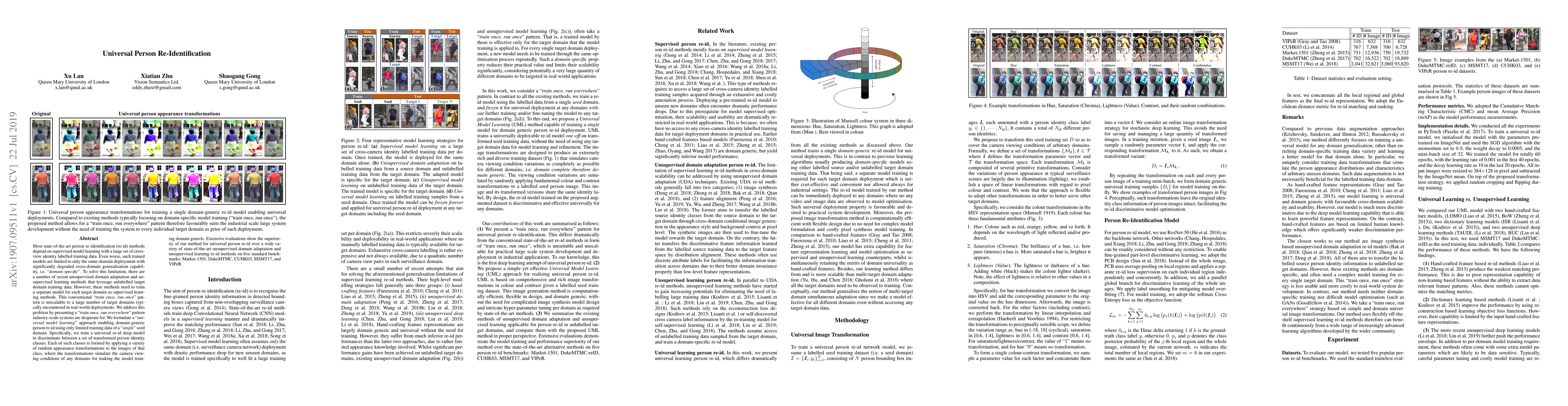 This paper proposes a "universal model learning" approach for person re-identification that trains a single deep model to generalize across multiple domains without requiring separate models for each target domain. The method uses a variety of random transformations to simulate diverse camera conditions, achieving superior performance over existing unsupervised domain adaptation techniques on five standard benchmarks.