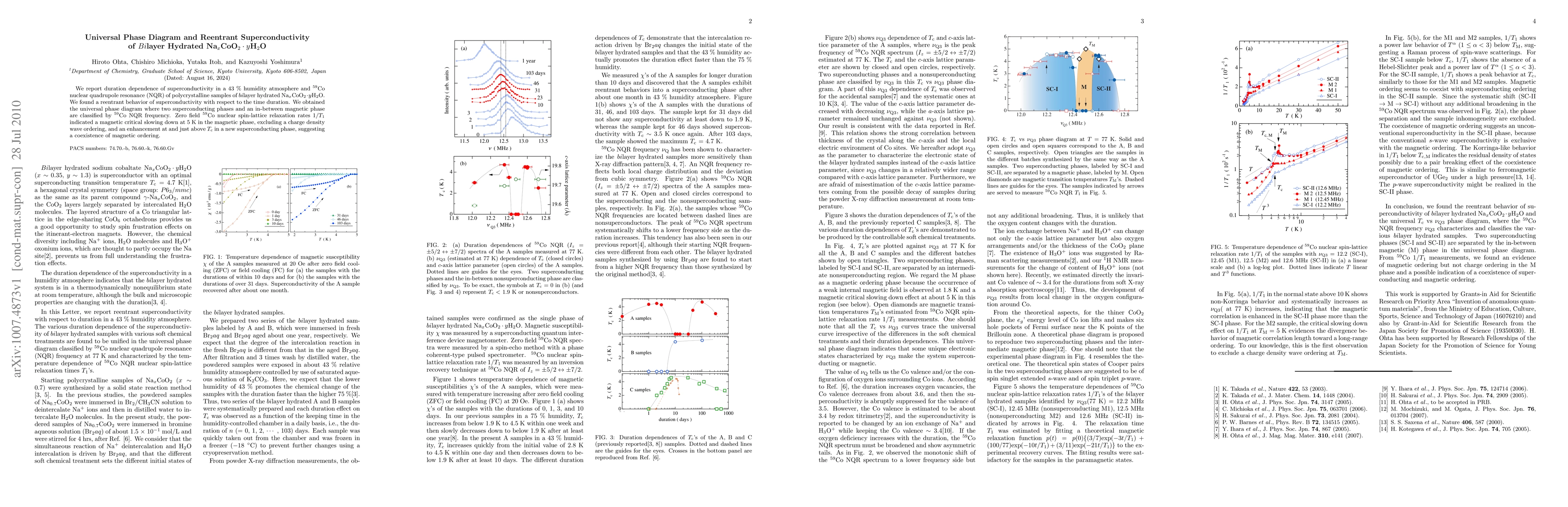We report duration dependence of superconductivity in a 43 \% humidity atmosphere and $^{59}$Co nuclear quadrupole resonance (NQR) of polycrystalline samples of $bi$layer hydrated Na$_x$CoO$_2 \cdot y$H$_2$O. We found a reentrant behavior of superconductivity with respect to the time duration. We obtained the universal phase diagram where two superconducting phases and an in-between magnetic phase are classified by $^{59}$Co NQR frequency. Zero field $^{59}$Co nuclear spin-lattice relaxation rates $1/T_1$ indicated a magnetic critical slowing down at 5 K in the magnetic phase, excluding a charge density wave ordering, and an enhancement at and just above $T_\mathrm{c}$ in a new superconducting phase, suggesting a coexistence of magnetic ordering.