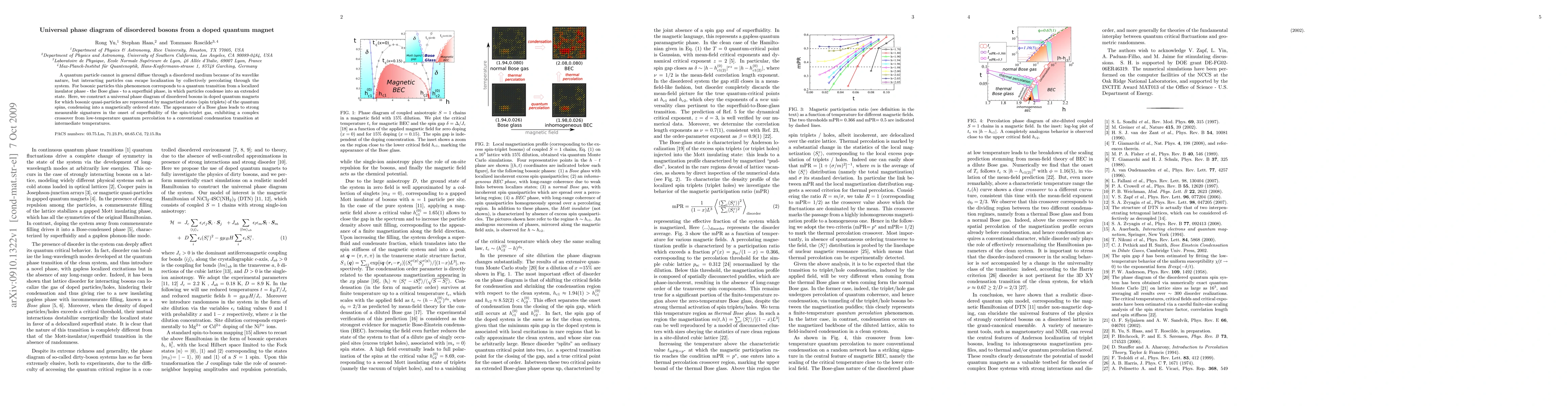 This paper constructs a universal phase diagram for disordered bosons in doped quantum magnets, showing a transition from a localized Bose glass phase to a superfluid phase. It highlights the complex crossover from quantum percolation to conventional condensation in spin-triplet states.
