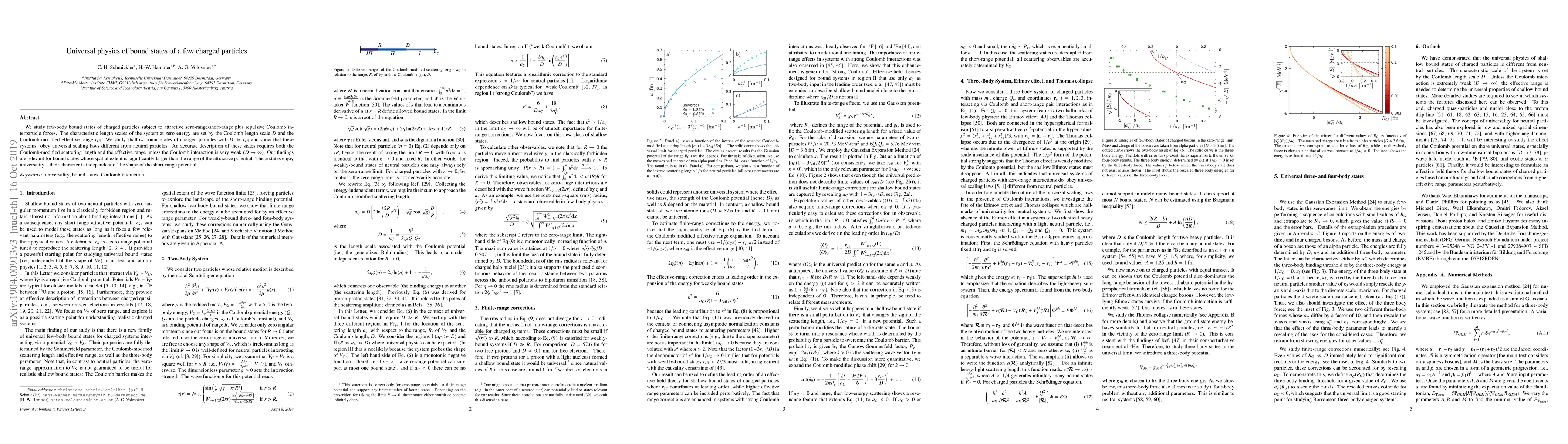 This paper investigates the universal physics of few-body bound states of charged particles under attractive and repulsive forces, revealing distinct scaling laws compared to neutral particles. It emphasizes the importance of Coulomb-modified scattering length and effective range for accurate descriptions, especially for systems with large spatial extents relative to the attractive potential range.