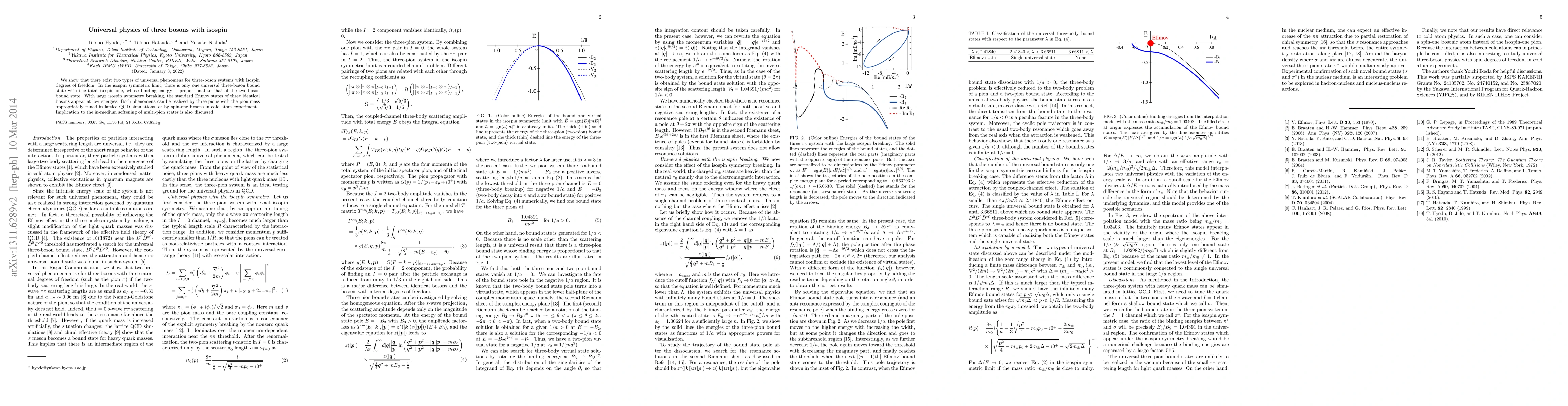 We show that there exist two types of universal phenomena for three-boson systems with isospin degrees of freedom. In the isospin symmetric limit, there is only one universal three-boson bound state with the total isospin one, whose binding energy is proportional to that of the two-boson bound state. With large isospin symmetry breaking, the standard Efimov states of three identical bosons appear at low energies. Both phenomena can be realized by three pions with the pion mass appropriately tuned in lattice QCD simulations, or by spin-one bosons in cold atom experiments. Implication to the in-medium softening of multi-pion states is also discussed.