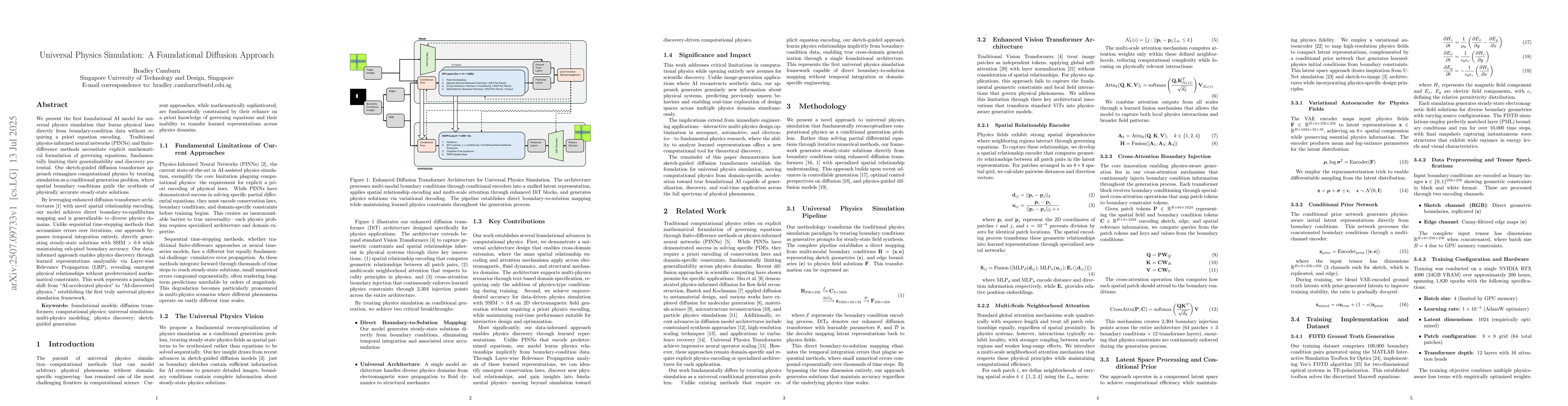 We present the first foundational AI model for universal physics simulation that learns physical laws directly from boundary-condition data without requiring a priori equation encoding. Traditional physics-informed neural networks (PINNs) and finite-difference methods necessitate explicit mathematical formulation of governing equations, fundamentally limiting their generalizability and discovery potential. Our sketch-guided diffusion transformer approach reimagines computational physics by treating simulation as a conditional generation problem, where spatial boundary conditions guide the synthesis of physically accurate steady-state solutions. By leveraging enhanced diffusion transformer architectures with novel spatial relationship encoding, our model achieves direct boundary-to-equilibrium mapping and is generalizable to diverse physics domains. Unlike sequential time-stepping methods that accumulate errors over iterations, our approach bypasses temporal integration entirely, directly generating steady-state solutions with SSIM > 0.8 while maintaining sub-pixel boundary accuracy. Our data-informed approach enables physics discovery through learned representations analyzable via Layer-wise Relevance Propagation (LRP), revealing emergent physical relationships without predetermined mathematical constraints. This work represents a paradigm shift from AI-accelerated physics to AI-discovered physics, establishing the first truly universal physics simulation framework.