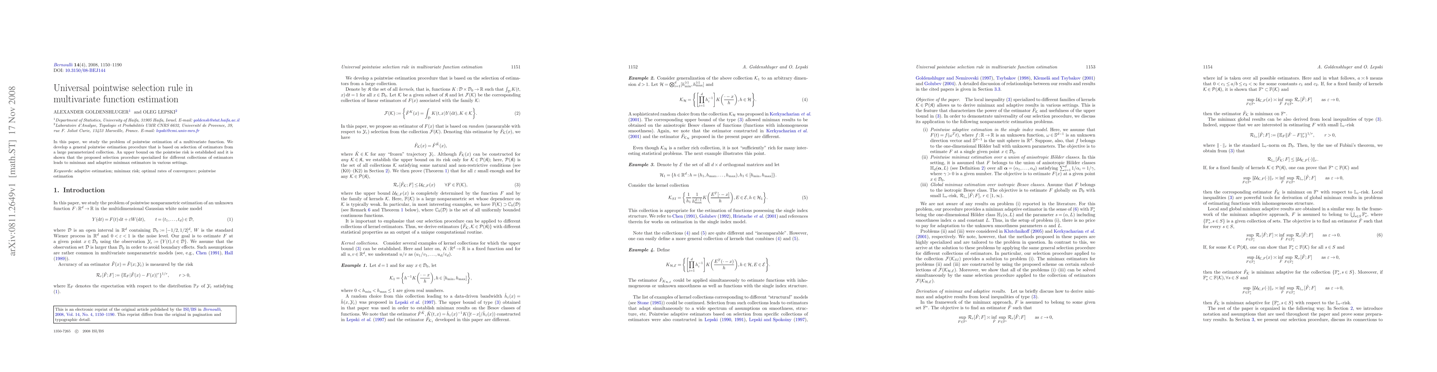 This paper introduces a universal pointwise selection rule for estimating multivariate functions, developing a procedure that selects from a large collection of estimators. It establishes an upper bound on the pointwise risk and demonstrates that the method yields minimax and adaptive minimax estimators across different settings.