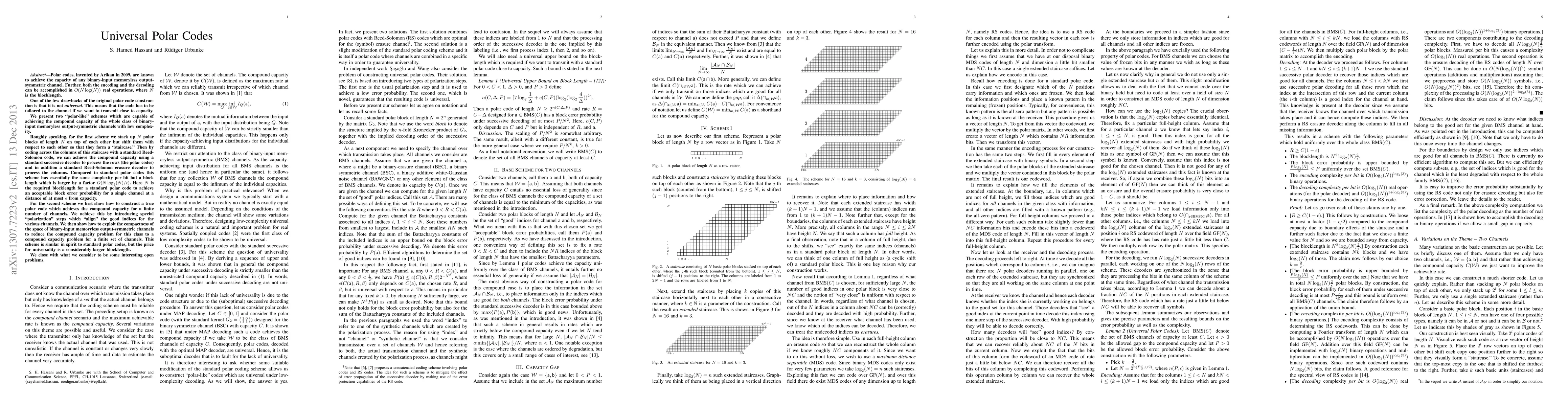 Polar codes, invented by Arikan in 2009, are known to achieve the capacity of any binary-input memoryless output-symmetric channel. One of the few drawbacks of the original polar code construction is that it is not universal. This means that the code has to be tailored to the channel if we want to transmit close to capacity. We present two "polar-like" schemes which are capable of achieving the compound capacity of the whole class of binary-input memoryless output-symmetric channels with low complexity. Roughly speaking, for the first scheme we stack up $N$ polar blocks of length $N$ on top of each other but shift them with respect to each other so that they form a "staircase." Coding then across the columns of this staircase with a standard Reed-Solomon code, we can achieve the compound capacity using a standard successive decoder to process the rows (the polar codes) and in addition a standard Reed-Solomon erasure decoder to process the columns. Compared to standard polar codes this scheme has essentially the same complexity per bit but a block length which is larger by a factor $O(N \log_2(N)/\epsilon)$, where $\epsilon$ is the gap to capacity. For the second scheme we first show how to construct a true polar code which achieves the compound capacity for a finite number of channels. We achieve this by introducing special "polarization" steps which "align" the good indices for the various channels. We then show how to exploit the compactness of the space of binary-input memoryless output-symmetric channels to reduce the compound capacity problem for this class to a compound capacity problem for a finite set of channels. This scheme is similar in spirit to standard polar codes, but the price for universality is a considerably larger blocklength. We close with what we consider to be some interesting open problems.