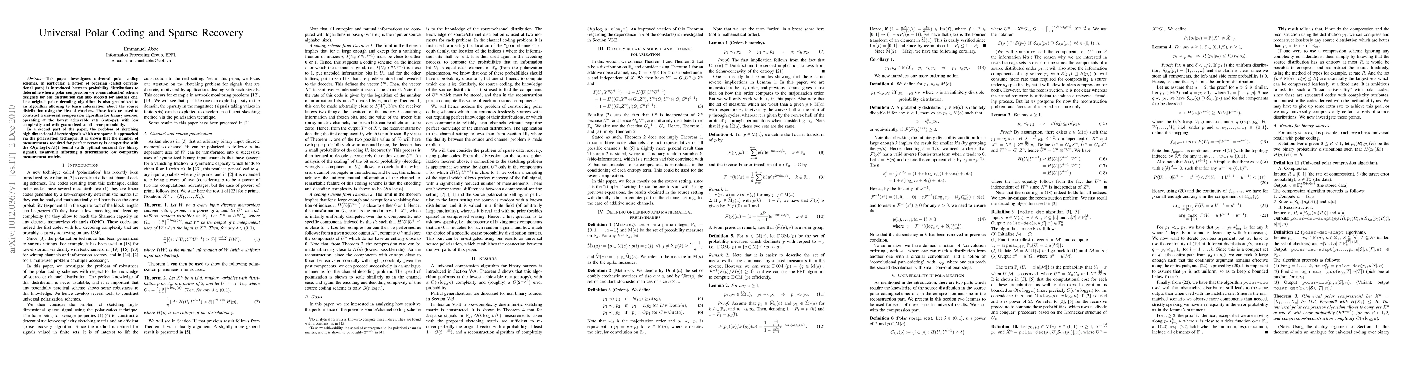 This paper investigates universal polar coding schemes. In particular, a notion of ordering (called convolutional path) is introduced between probability distributions to determine when a polar compression (or communication) scheme designed for one distribution can also succeed for another one. The original polar decoding algorithm is also generalized to an algorithm allowing to learn information about the source distribution using the idea of checkers. These tools are used to construct a universal compression algorithm for binary sources, operating at the lowest achievable rate (entropy), with low complexity and with guaranteed small error probability. In a second part of the paper, the problem of sketching high dimensional discrete signals which are sparse is approached via the polarization technique. It is shown that the number of measurements required for perfect recovery is competitive with the $O(k \log (n/k))$ bound (with optimal constant for binary signals), meanwhile affording a deterministic low complexity measurement matrix.