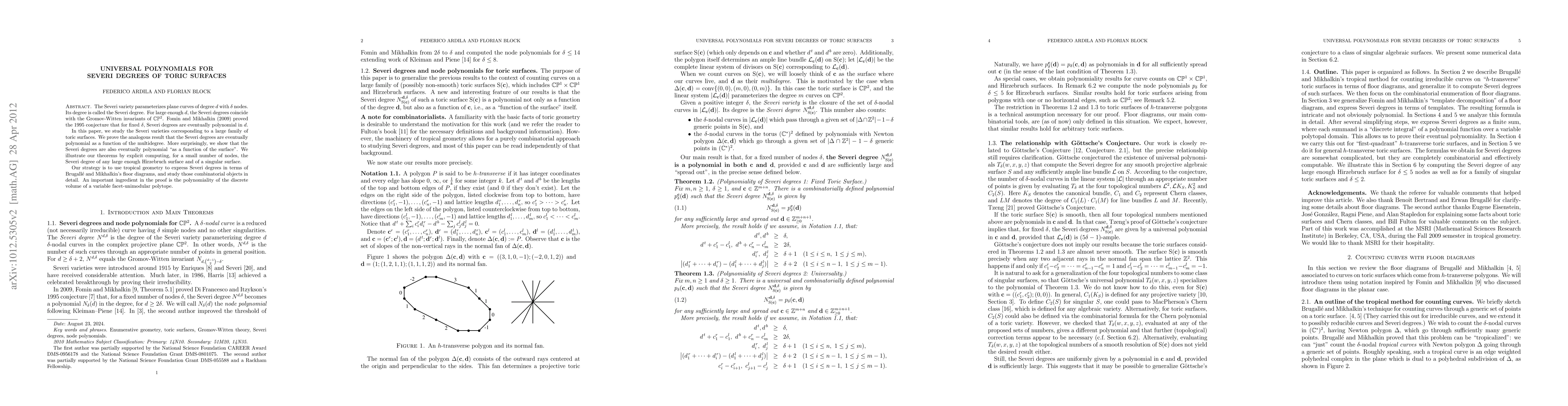 The Severi variety parameterizes plane curves of degree d with delta nodes. Its degree is called the Severi degree. For large enough d, the Severi degrees coincide with the Gromov-Witten invariants of P^2. Fomin and Mikhalkin (2009) proved the 1995 conjecture that, for fixed delta, Severi degrees are eventually polynomial in d. In this paper, we study the Severi varieties corresponding to a large family of toric surfaces. We prove the analogous result that the Severi degrees are eventually polynomial as a function of the multidegree. More surprisingly, we show that the Severi degrees are also eventually polynomial "as a function of the surface". We illustrate our theorems by explicit computing, for a small number of nodes, the Severi degree of any large enough Hirzebruch surface and of a singular surface. Our strategy is to use tropical geometry to express Severi degrees in terms of Brugalle and Mikhalkin's floor diagrams, and study those combinatorial objects in detail. An important ingredient in the proof is the polynomiality of the discrete volume of a variable facet-unimodular polytope.
