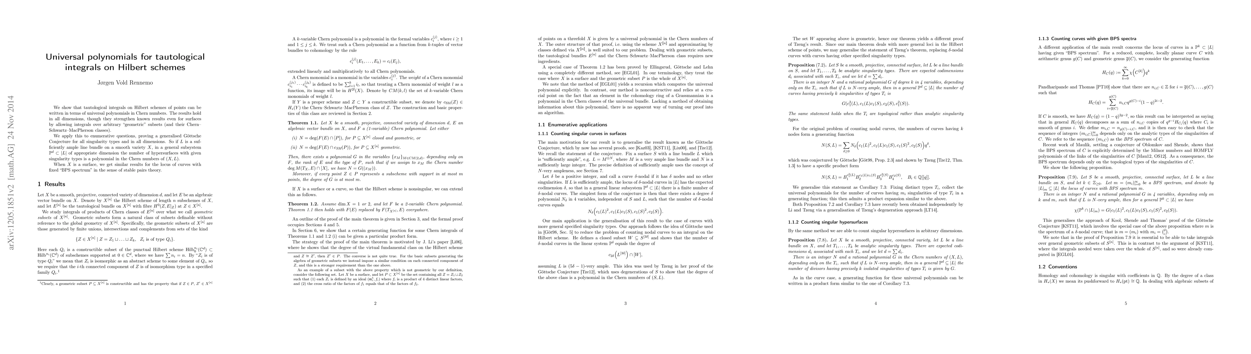 We show that tautological integrals on Hilbert schemes of points can be written in terms of universal polynomials in Chern numbers. The results hold in all dimensions, though they strengthen known results even for surfaces by allowing integrals over arbitrary "geometric" subsets (and their Chern-Schwartz-MacPherson classes). We apply this to enumerative questions, proving a generalised G\"ottsche Conjecture for all singularity types and in all dimensions. So if L is a sufficiently ample line bundle on a smooth variety X, in a general subsystem P^d of |L| of appropriate dimension the number of hypersurfaces with given singularity types is a polynomial in the Chern numbers of (X,L). When X is a surface, we get similar results for the locus of curves with fixed "BPS spectrum" in the sense of stable pairs theory.