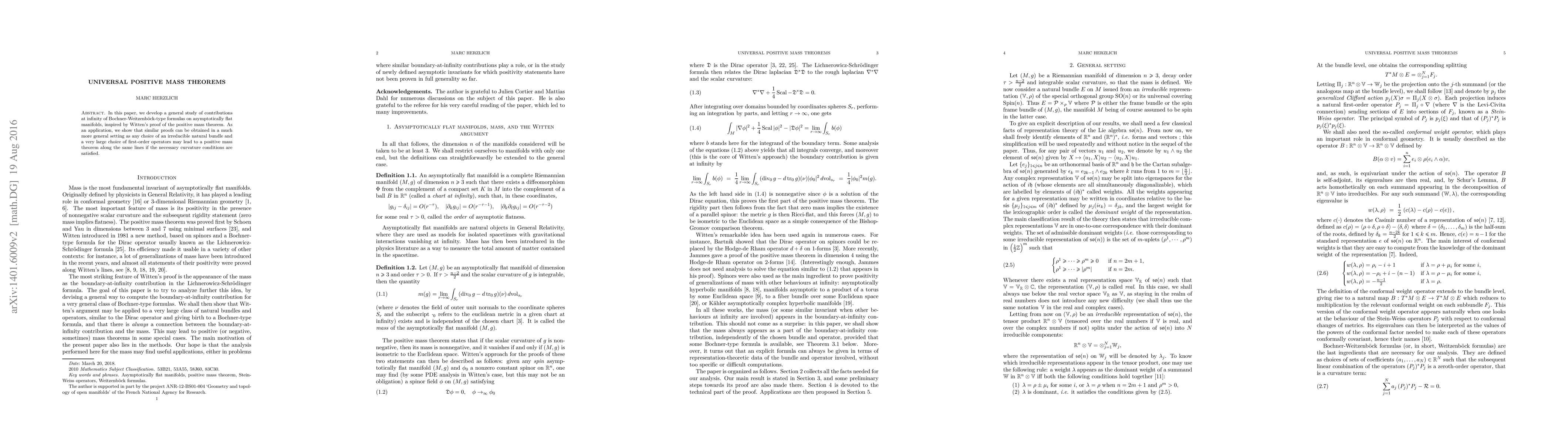 In this paper, we develop a general study of contributions at infinity of Bochner-Weitzenb\"ock-type formulas on asymptotically flat manifolds, inspired by Witten's proof of the positive mass theorem. As an application, we show that similar proofs can be obtained in a much more general setting as any choice of an irreducible natural bundle and a very large choice of first-order operators may lead to a positive mass theorem along the same lines if the necessary curvature conditions are satisfied.