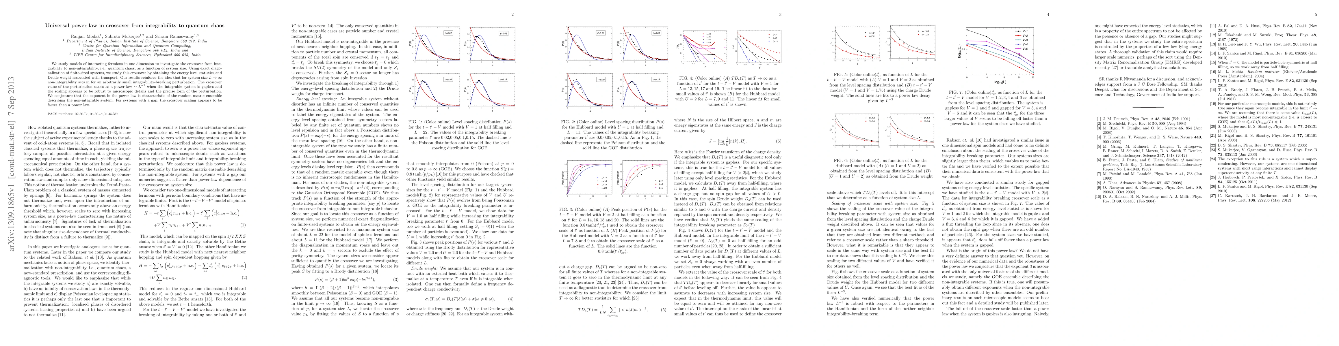 This paper investigates the transition from integrability to quantum chaos in one-dimensional fermion systems, finding that the crossover value scales as a power law with system size, specifically $\sim L^{-3}$ for gapless systems. The study suggests that this exponent is tied to the random matrix ensemble characterizing the chaotic regime.