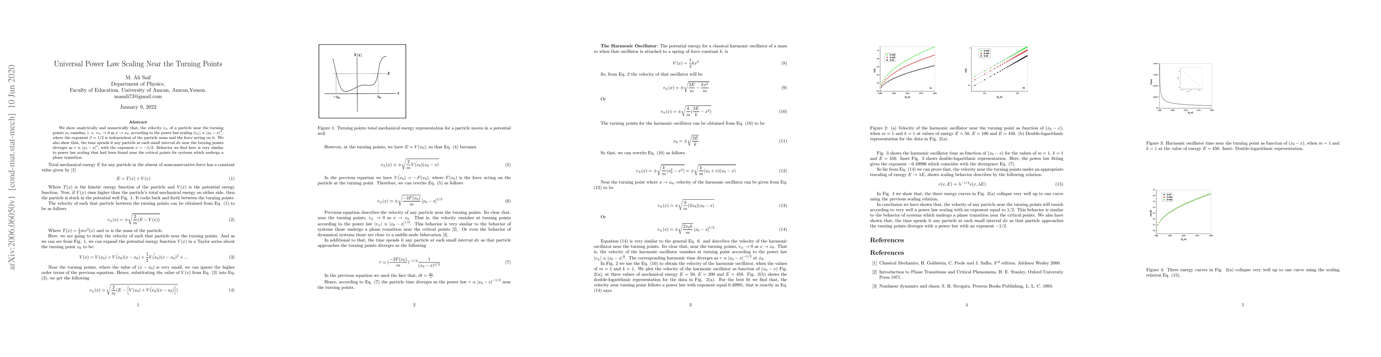 This paper demonstrates analytically and numerically that near turning points, particle velocity follows a power law scaling with an exponent $\beta=1/2$, independent of mass and force. Additionally, the time spent near these points diverges with an exponent $\nu=-1/2$, similar to critical scaling in phase transitions.