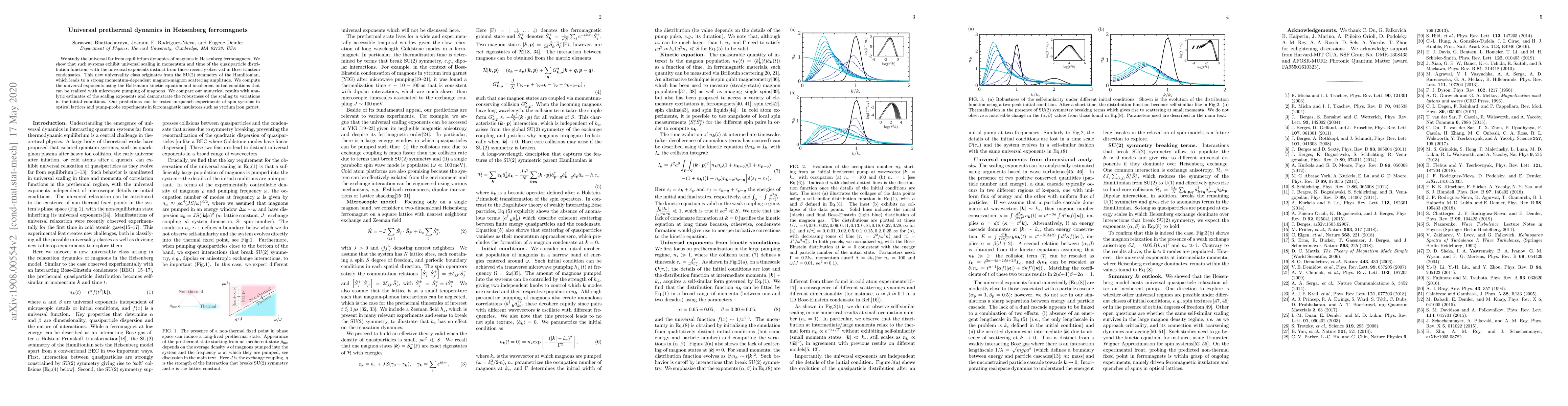 This paper investigates the universal prethermal dynamics of magnons in Heisenberg ferromagnets, revealing distinct scaling behavior from Bose-Einstein condensates due to the SU(2) symmetry. The study uses the Boltzmann kinetic equation to compute universal exponents and demonstrates robustness against initial condition variations, with potential experimental verification in spin systems and ferromagnetic insulators.