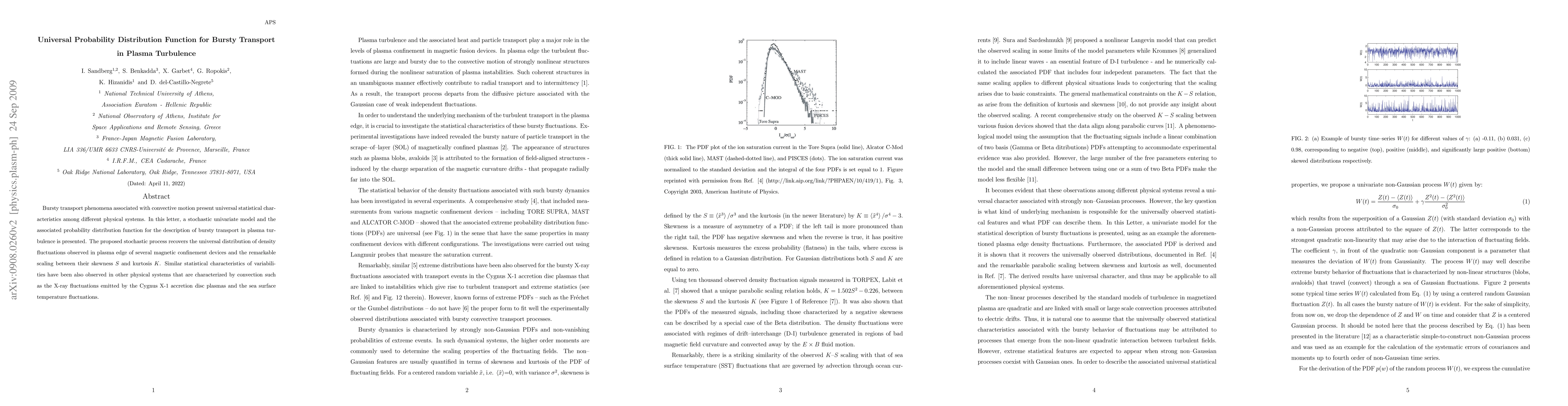 This paper introduces a stochastic model and its probability distribution function to describe bursty transport in plasma turbulence, revealing universal statistical characteristics across different physical systems, including plasma edge fluctuations and X-ray emissions from accretion discs. The model captures the observed scaling between skewness and kurtosis in these systems.