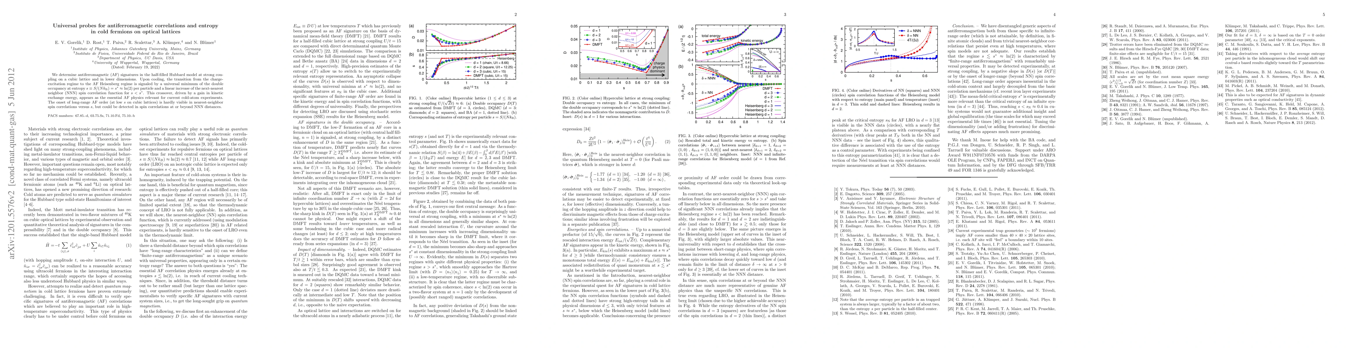 This paper investigates antiferromagnetic signatures in the half-filled Hubbard model on optical lattices, revealing a universal minimum in double occupancy at a specific entropy level. It highlights the transition from charge-excitation to AF Heisenberg regime, detectable via next-nearest neighbor spin correlations.