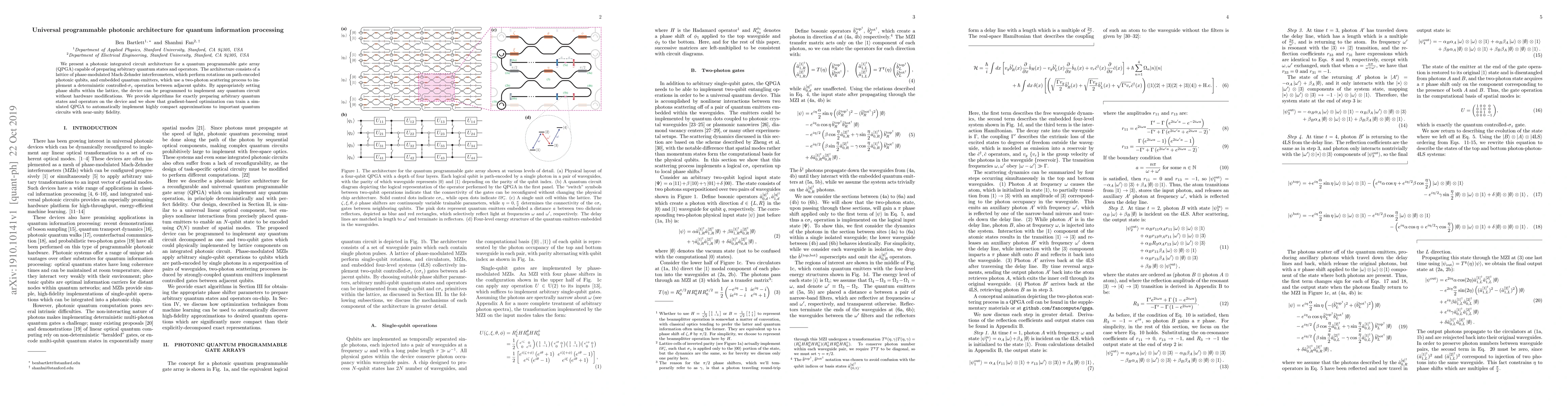 This paper introduces a photonic integrated circuit architecture for a quantum programmable gate array (QPGA) that can prepare arbitrary quantum states and operators using phase-modulated Mach-Zehnder interferometers and embedded quantum emitters. The device can be programmed to implement any quantum circuit without hardware changes, and algorithms are provided for preparing quantum states with high fidelity.