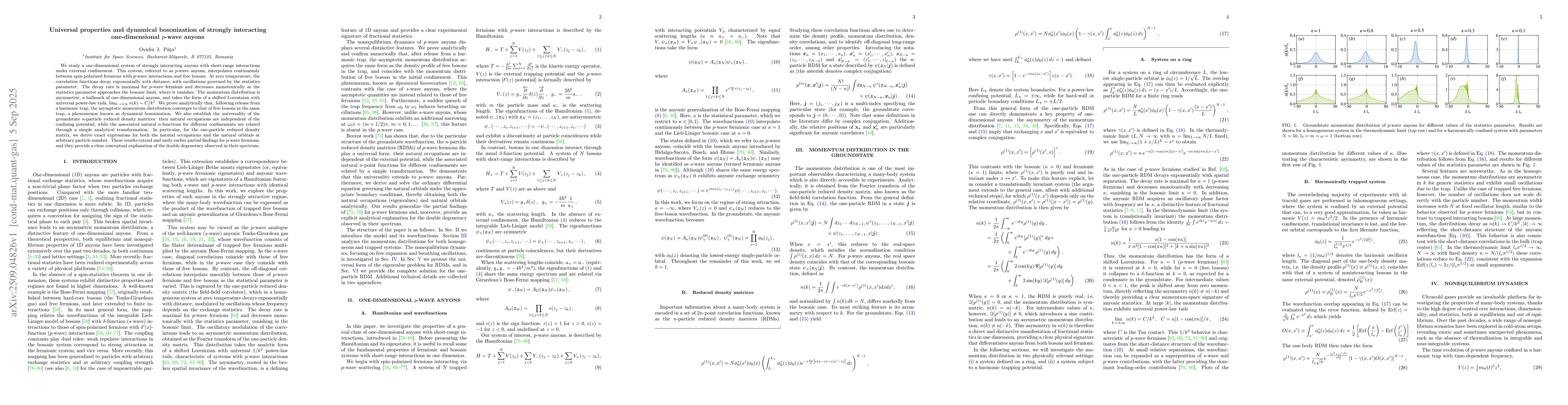 We study a one-dimensional system of strongly interacting anyons with short-range interactions under external confinement. This system, referred to as $p$-wave anyons, interpolates continuously between spin-polarized fermions with $p$-wave interactions and free bosons. At zero temperature, the correlation functions decay exponentially with distance, with oscillations governed by the statistics parameter. The decay rate is maximal for $p$-wave fermions and decreases monotonically as the statistics parameter approaches the bosonic limit, where it vanishes. The momentum distribution is asymmetric, a hallmark of one-dimensional anyons, and takes the form of a shifted Lorentzian with universal power-law tails, $\lim_{k \to \pm \infty} n(k)\sim C/k^2$. We prove analytically that, following release from a harmonic trap, the asymptotic momentum distribution converges to that of free bosons in the same trap, a phenomenon known as dynamical bosonization. We also establish the universality of the groundstate $n$-particle reduced density matrices: their natural occupations are independent of the confining potential, while the associated natural $n$-functions for different confinements are related through a simple analytical transformation. In particular, for the one-particle reduced density matrix, we derive exact expressions for both the natural occupations and the natural orbitals at arbitrary particle number. These results extend and unify earlier partial findings for $p$-wave fermions, and they provide a clear conceptual explanation of the double degeneracy observed in their spectrum.