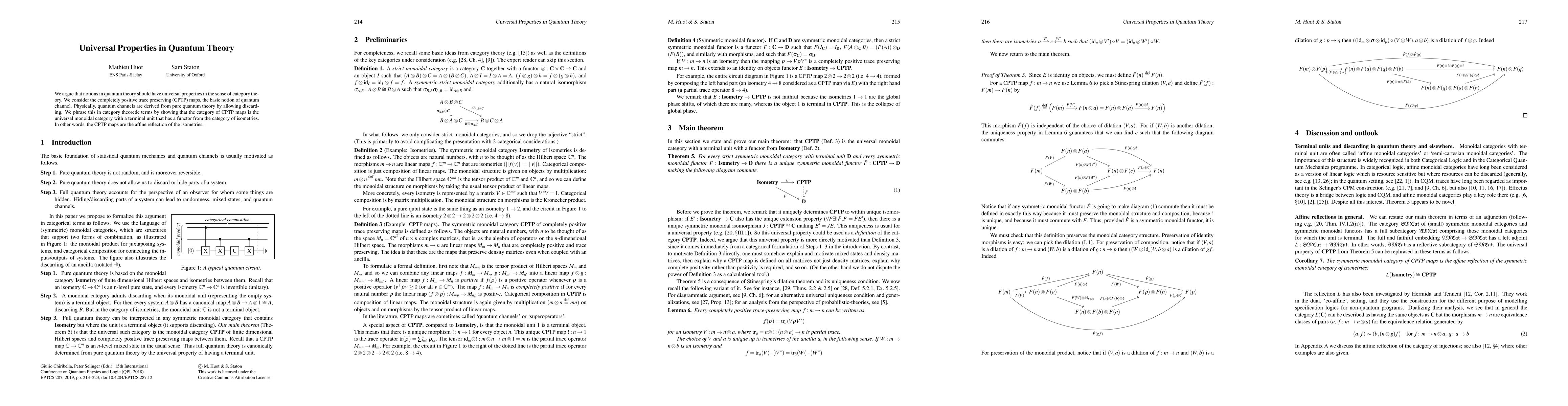 Researchers argue that quantum channels in quantum theory should have universal properties, which they demonstrate through category theory, showing CPTP maps as the affine reflection of isometries.