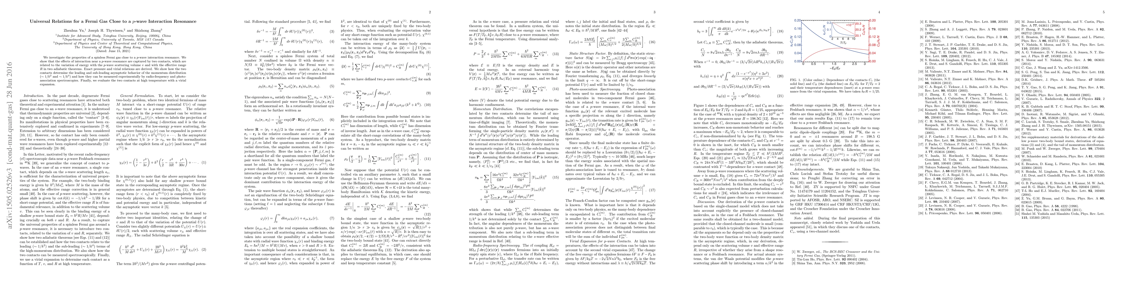 In this letter, we investigate the properties of a strongly interacting spinless Fermi gas close to a $p$-wave resonance. We show that the universal properties at a $p$-wave resonance are captured by two contacts, which are related respectively to the variation of energy with the $p$-wave scattering volume $v$ and with the effective range $R$ in the two adiabatic theorems derived. We show how the two contacts determine the leading and sub-leading asymptotic behavior of the momentum distribution ($\sim 1/k^2$ and $\sim 1/k^4$) and how they can be measured experimentally by radio-frequency, Bragg, and photo-association spectroscopies. Finally, we evaluate the two contacts at high temperature via the virial expansion.