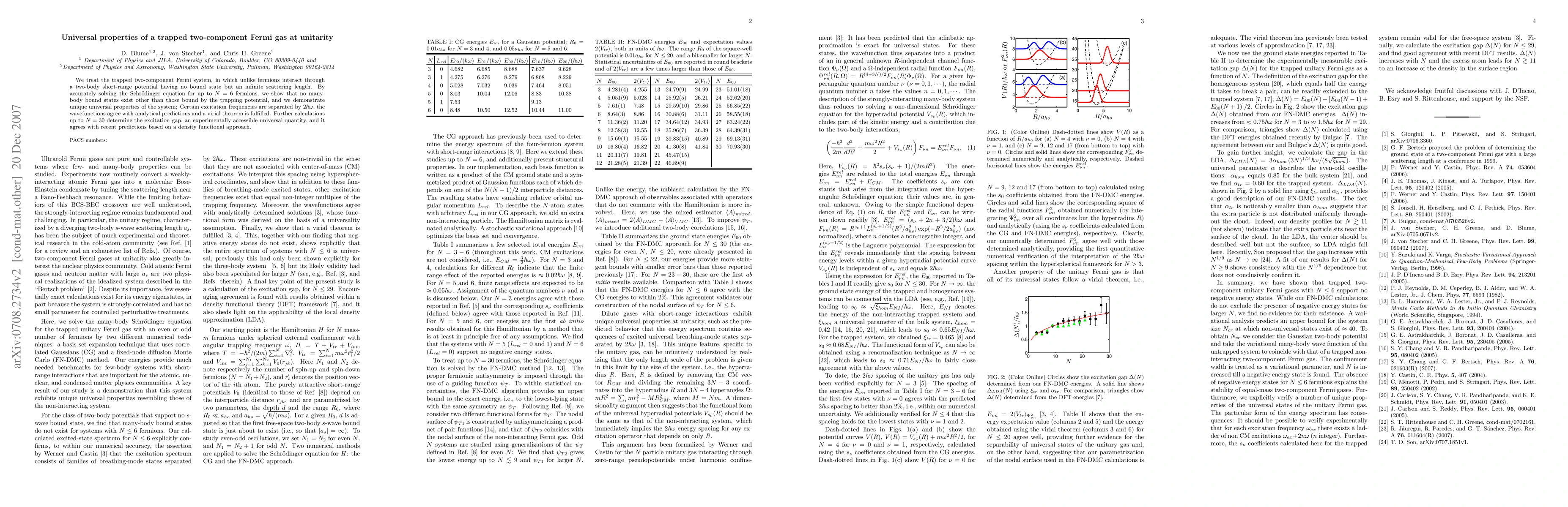 We treat the trapped two-component Fermi system, in which unlike fermions interact through a two-body short-range potential having no bound state but an infinite scattering length. By accurately solving the Schroedinger equation for up to N=6 fermions, we show that no many-body bound states exist other than those bound by the trapping potential, and we demonstrate unique universal properties of the system: Certain excitation frequencies are separated by $2\hbar\omega$, the wavefunctions agree with analytical predictions and a virial theorem is fulfilled. Further calculations up to N=30 determine the excitation gap, an experimentally accessible universal quantity, and it agrees with recent predictions based on a density functional approach.