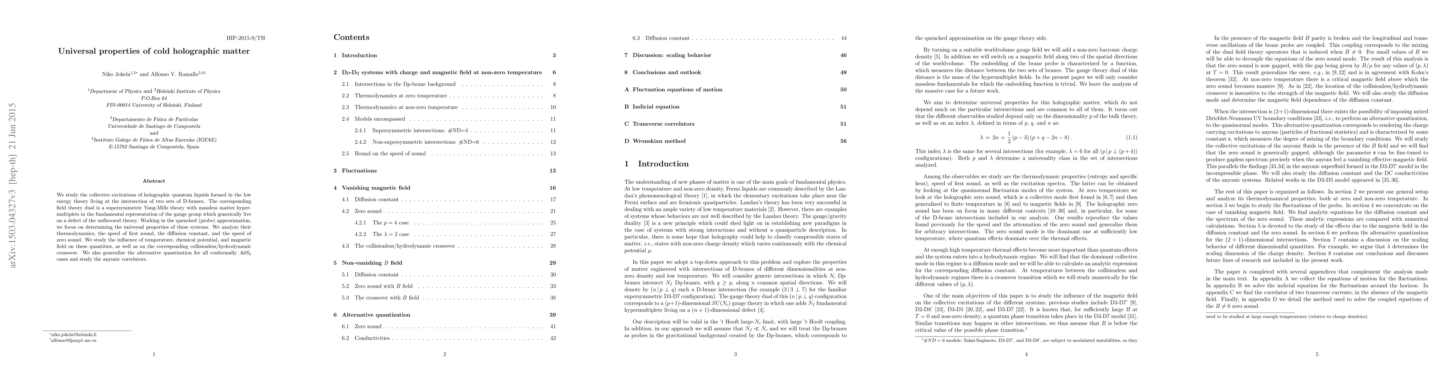 We study the collective excitations of holographic quantum liquids formed in the low energy theory living at the intersection of two sets of D-branes. The corresponding field theory dual is a supersymmetric Yang-Mills theory with massless matter hypermultiplets in the fundamental representation of the gauge group which generically live on a defect of the unflavored theory. Working in the quenched (probe) approximation, we focus on determining the universal properties of these systems. We analyze their thermodynamics, the speed of first sound, the diffusion constant, and the speed of zero sound. We study the influence of temperature, chemical potential, and magnetic field on these quantities, as well as on the corresponding collisionless/hydrodynamic crossover. We also generalize the alternative quantization for all conformally $AdS_4$ cases and study the anyonic correlators.
