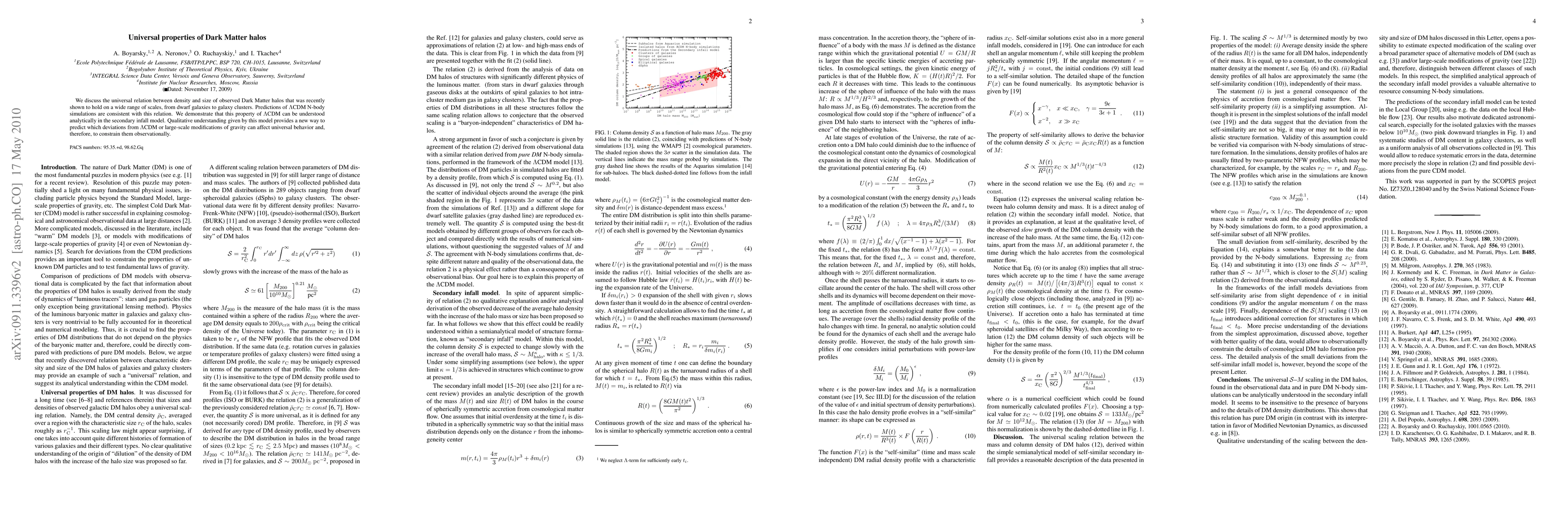 We discuss the universal relation between density and size of observed Dark Matter halos that was recently shown to hold on a wide range of scales, from dwarf galaxies to galaxy clusters. Predictions of LambdaCDM N-body simulations are consistent with this relation. We demonstrate that this property of LambdaCDM can be understood analytically in the secondary infall model. Qualitative understanding given by this model provides a new way to predict which deviations from LambdaCDM or large-scale modifications of gravity can affect universal behavior and, therefore, to constrain them observationally.