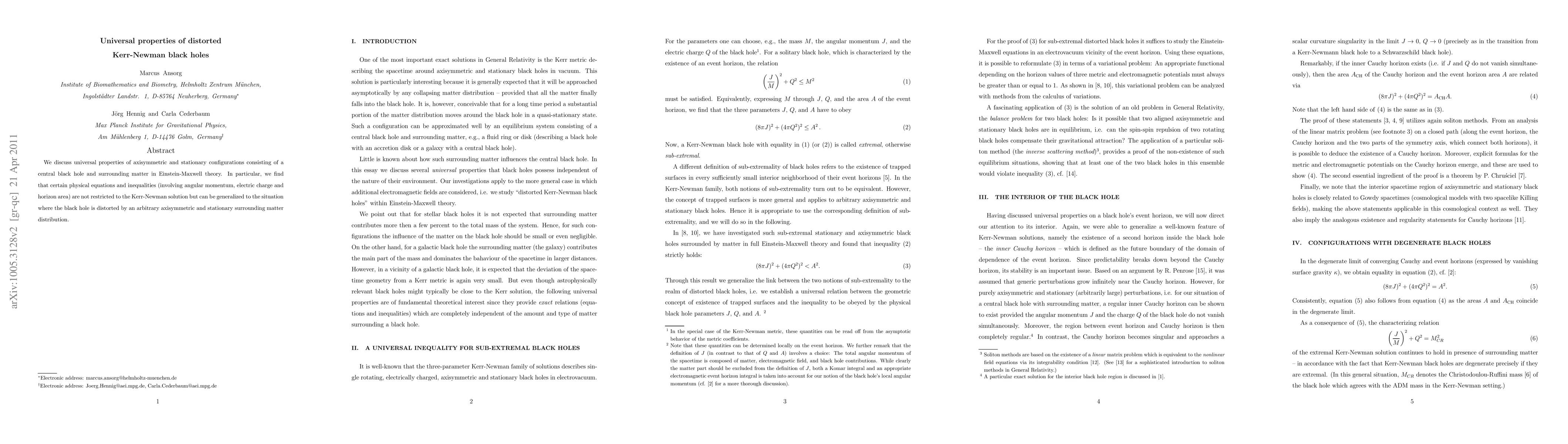 We discuss universal properties of axisymmetric and stationary configurations consisting of a central black hole and surrounding matter in Einstein-Maxwell theory. In particular, we find that certain physical equations and inequalities (involving angular momentum, electric charge and horizon area) are not restricted to the Kerr-Newman solution but can be generalized to the situation where the black hole is distorted by an arbitrary axisymmetric and stationary surrounding matter distribution.