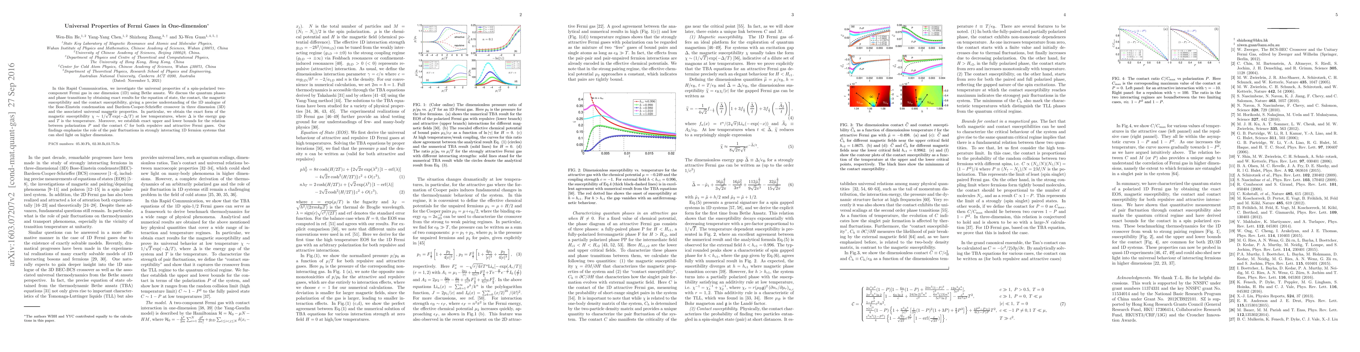 This paper uses Bethe ansatz to explore the universal properties of a spin-polarized Fermi gas in one dimension, revealing exact results for quantum phases, phase transitions, and magnetic susceptibility, and establishing bounds for polarization and contact relations. The findings highlight the significance of pair fluctuations in understanding 1D fermion systems and their implications for higher dimensions.