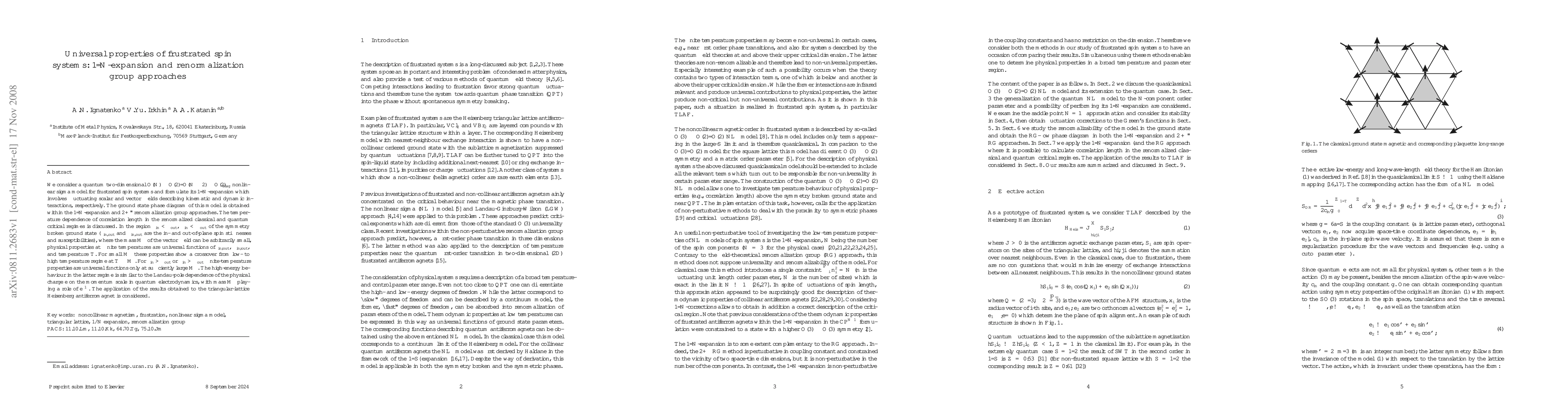 We consider a quantum two-dimensional O(N)xO(2)/O(N-2)xO(2) nonlinear sigma model for frustrated spin systems and formulate its 1/N-expansion which involves fluctuating scalar and vector fields describing kinematic and dynamic interactions, respectively. The ground state phase diagram of this model is obtained within the 1/N-expansion and 2+\epsilon renormalization group approaches. The temperature dependence of correlation length in the renormalized classical and quantum critical regimes is discussed. In the region of the symmetry broken ground state \rho_in<\rho_out, \chi_in<\chi_out (rho_in,out and chi_in,out are the in- and out-of-plane spin stiffnesses and susceptibilities), where the mass M_\mu of the vector field can be arbitrarily small, physical properties at finite temperatures are universal functions of rho_in,out, chi_in,out, and temperature T. For small M_\mu these properties show a crossover from low- to high temperature regime at T \sim M_\mu. For \rho_in>\rho_out or \chi_in>\chi_out finite-temperature properties are universal functions only at sufficiently large M_\mu. The high-energy behaviour in the latter regime is similar to the Landau-pole dependence of the physical charge e in quantum electrodynamics, with mass M_\mu playing a role of e^{-1}. The application of the results obtained to the triangular-lattice Heisenberg antiferromagnet is considered.