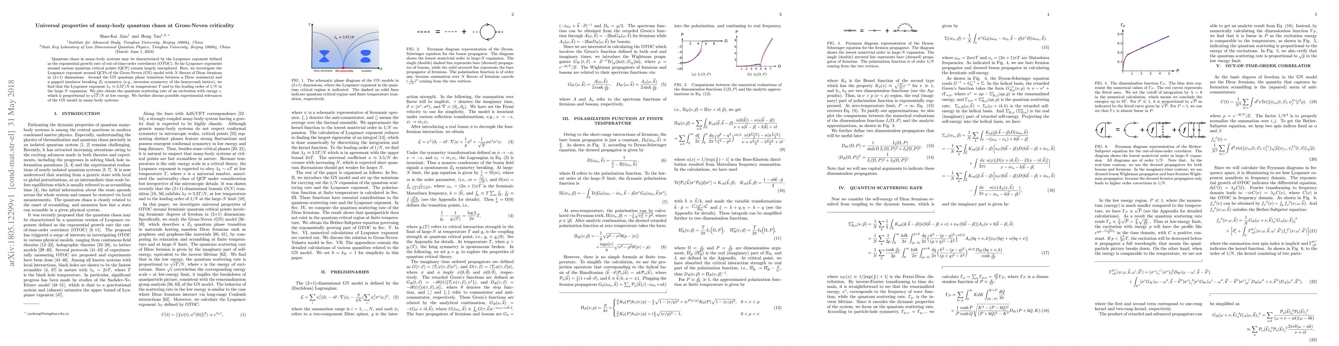 Quantum chaos in many-body systems may be characterized by the Lyapunov exponent defined as the exponential growth rate of out-of-time-order correlators (OTOC). So far Lyaponov exponents around various quantum critical points (QCP) remain largely unexplored. Here, we investigate the Lyapunov exponent around QCPs of the Gross-Neveu (GN) model with $N$ flavors of Dirac fermions in (2+1) dimensions. Around the GN quantum phase transition between a Dirac semimetal and a gapped insulator breaking $Z_2$ symmetry (e.g., inversion symmetry of the honeycomb lattice), we find that the Lyaponov exponent $\lambda_L \approx 3.5 T/N$ at temperature $T$ and to the leading order of $1/N$ in the large-$N$ expansion. We also obtain the quantum scattering rate of an excitation with energy $\epsilon$, which is proportional to $\sqrt{\epsilon T}/N$ at low energy. We further discuss possible experimental relevances of the GN model in many-body systems.
