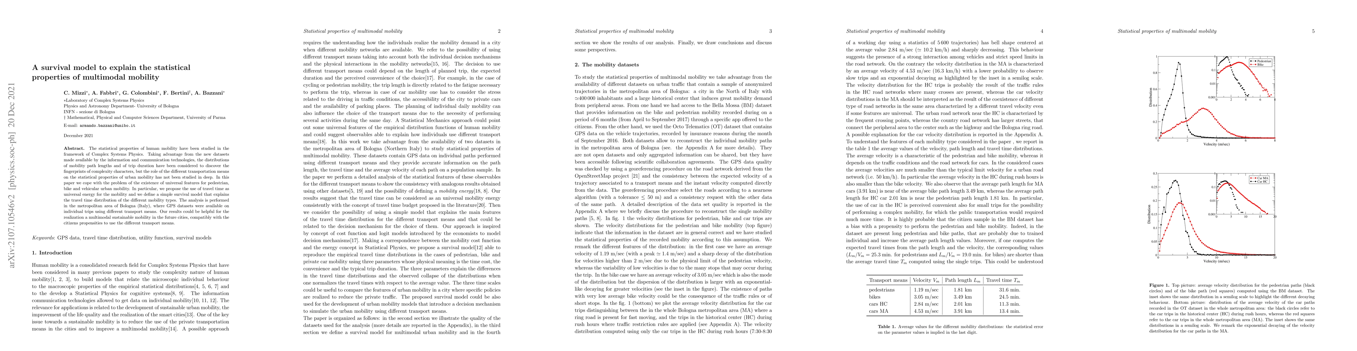 The statistical properties of human mobility have been studied in the framework of complex systems physics. Taking advantage from the new datasets made available by the information and communication technologies, the distributions of mobility path lengths and of trip duration have been considered to discover the fingerprints of complexity characters, but the role of the different transportation means on the statistical properties of urban mobility has not been studied in deep. In this paper we cope with the problem of pointing out the existence of universal features for different type of individual mobility: pedestrian, cycling and vehicular urban mobility. In particular, we propose the use of travel time as universal 'energy' for the mobility and we define a simple survival model that explains the travel time distribution of the different types of mobility. the analysis is performed in the metropolitan area of Bologna (Italy), where GPS datasets were available on individual trips using different transport means. Our results could suggest how to plan the different transportation networks to realize a multimodal mobility compatibly with the citizens propensities to use the different transport means.