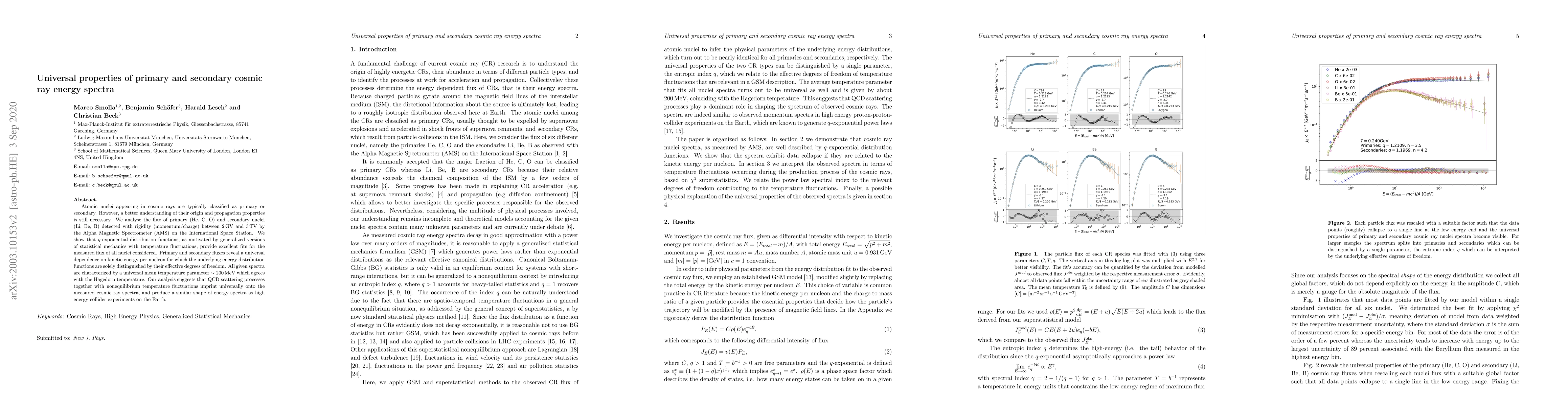 Atomic nuclei appearing in cosmic rays are typically classified as primary or secondary. However, a better understanding of their origin and propagation properties is still necessary. We analyse the flux of primary (He, C, O) and secondary nuclei (Li, Be, B) detected with rigidity (momentum/charge) between 2 GV and 3 TV by the Alpha Magnetic Spectrometer (AMS) on the International Space Station. We show that $q$-exponential distribution functions, as motivated by generalized versions of statistical mechanics with temperature fluctuations, provide excellent fits for the measured flux of all nuclei considered. Primary and secondary fluxes reveal a universal dependence on kinetic energy per nucleon for which the underlying energy distribution functions are solely distinguished by their effective degrees of freedom. All given spectra are characterized by a universal mean temperature parameter $\sim$ 200 MeV which agrees with the Hagedorn temperature. Our analysis suggests that QCD scattering processes together with nonequilibrium temperature fluctuations provide a plausible explanation for the observed universality in cosmic ray energy spectra. Our analysis suggests that QCD scattering processes together with nonequilibrium temperature fluctuations imprint universally onto the measured cosmic ray spectra, and produce a similar shape of energy spectra as high energy collider experiments on the Earth.