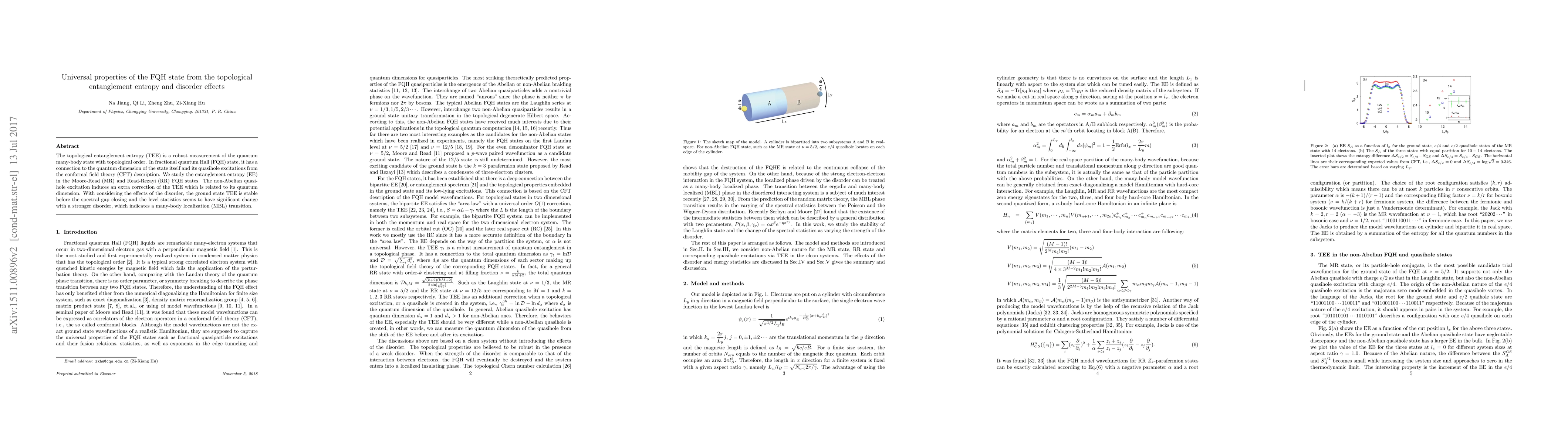 This paper investigates the topological entanglement entropy (TEE) in fractional quantum Hall (FQH) states, specifically the Moore-Read and Read-Rezayi states, revealing how non-Abelian quasihole excitations affect TEE. It finds that disorder induces a many-body localization transition, with TEE remaining stable before spectral gap closure.