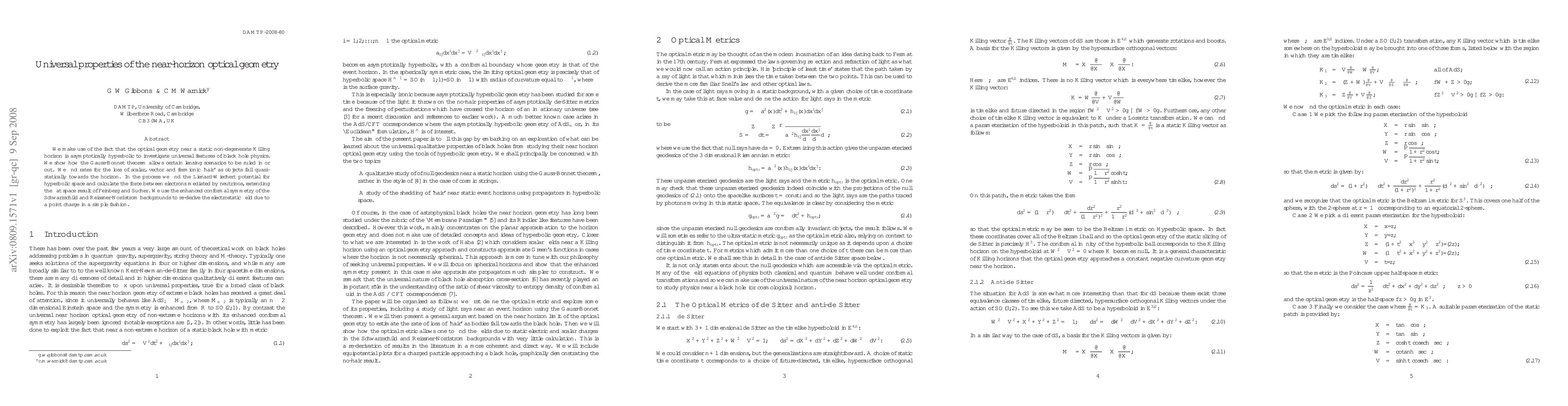 We make use of the fact that the optical geometry near a static non-degenerate Killing horizon is asymptotically hyperbolic to investigate universal features of black hole physics. We show how the Gauss-Bonnet theorem allows certain lensing scenarios to be ruled in or out. We find rates for the loss of scalar, vector and fermionic `hair' as objects fall quasi- statically towards the horizon. In the process we find the Lienard-Wiechert potential for hyperbolic space and calculate the force between electrons mediated by neutrinos, extending the flat space result of Feinberg and Sucher. We use the enhanced conformal symmetry of the Schwarzschild and Reissner-Nordstrom backgrounds to re-derive the electrostatic field due to a point charge in a simple fashion.