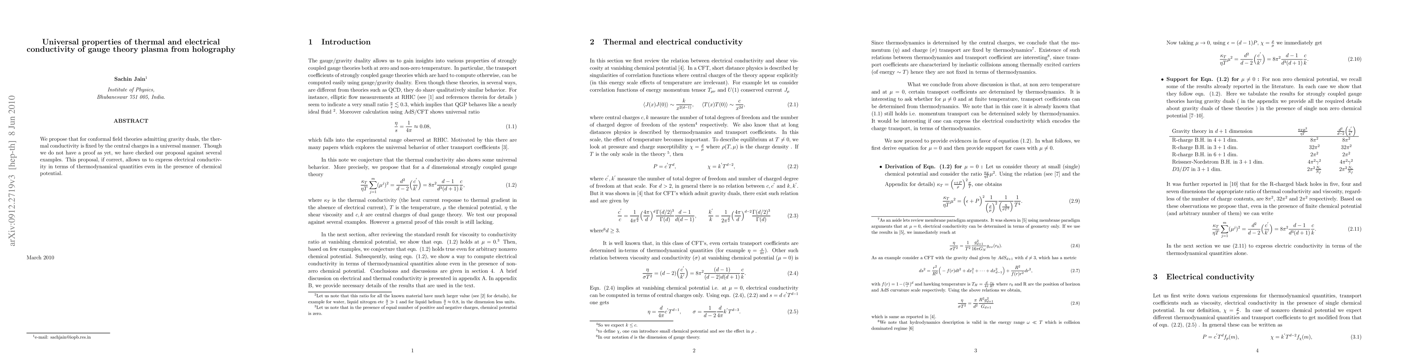 This paper proposes a universal relationship between thermal conductivity and central charges in conformal field theories with gravity duals, and suggests that electrical conductivity can be expressed in terms of thermodynamic quantities, even with a chemical potential, based on several verified examples.
