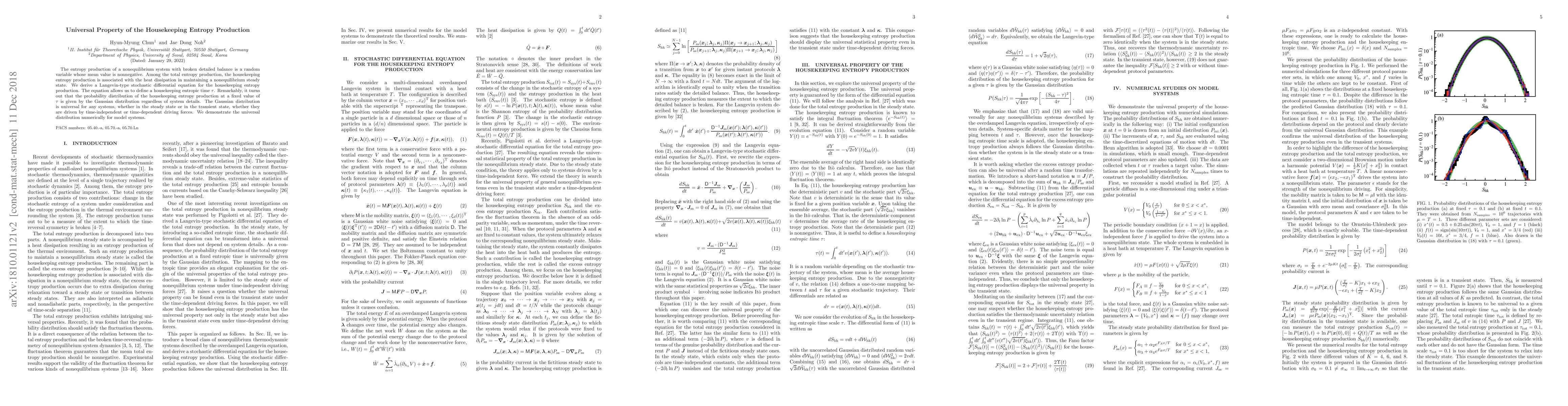 The entropy production of a nonequilibrium system with broken detailed balance is a random variable whose mean value is nonnegative. Among the total entropy production, the housekeeping entropy production is associated with the heat dissipation in maintaining a nonequilibrium steady state. We derive a Langevin-type stochastic differential equation for the housekeeping entropy production. The equation allows us to define a housekeeping entropic time $\tau$. Remarkably, it turns out that the probability distribution of the housekeeping entropy production at a fixed value of $\tau$ is given by the Gaussian distribution regardless of system details. The Gaussian distribution is universal for any systems, whether in the steady state or in the transient state, whether they are driven by time-independent or time-dependent driving forces. We demonstrate the universal distribution numerically for model systems.