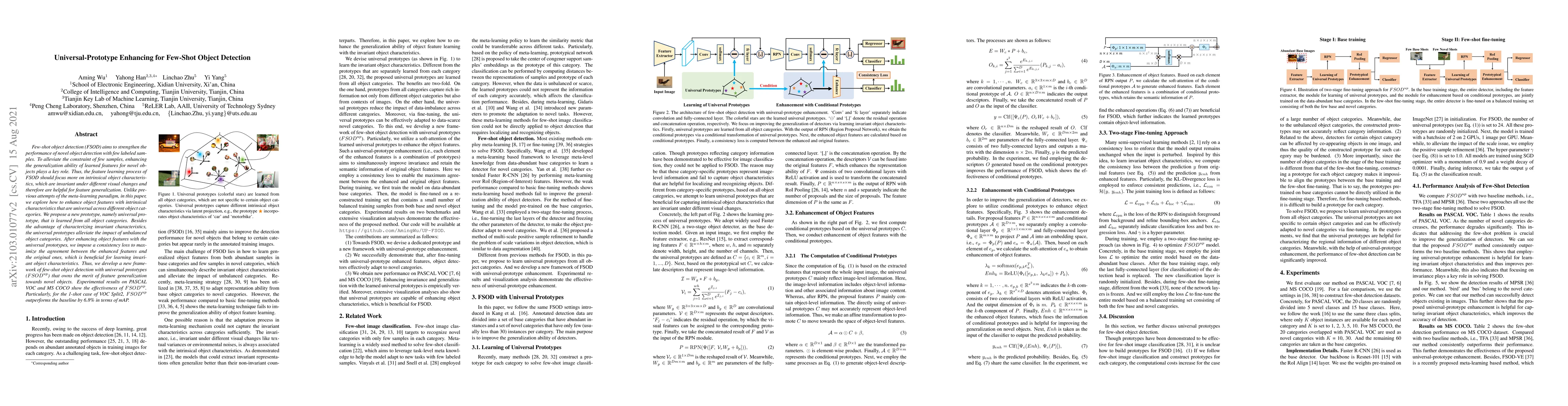 This paper proposes a framework for few-shot object detection (FSOD) that enhances feature learning through universal prototypes, which are learned from all object categories to capture invariant characteristics. The method improves generalization and performance, especially in the 1-shot case, as demonstrated by a 6.8% mAP improvement over the baseline on VOC Split2.