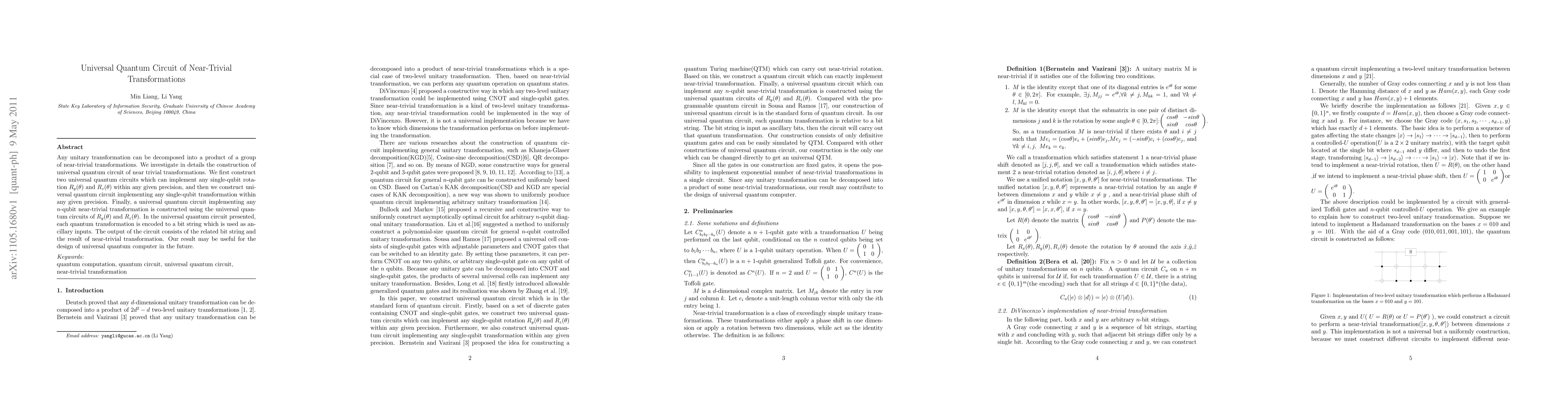 This paper details the construction of a universal quantum circuit that decomposes any unitary transformation into a series of near-trivial transformations, achieving precise single-qubit rotations and general single-qubit transformations, and extending to n-qubit systems. This approach uses ancillary inputs encoded as bit strings, potentially aiding future quantum computer design.