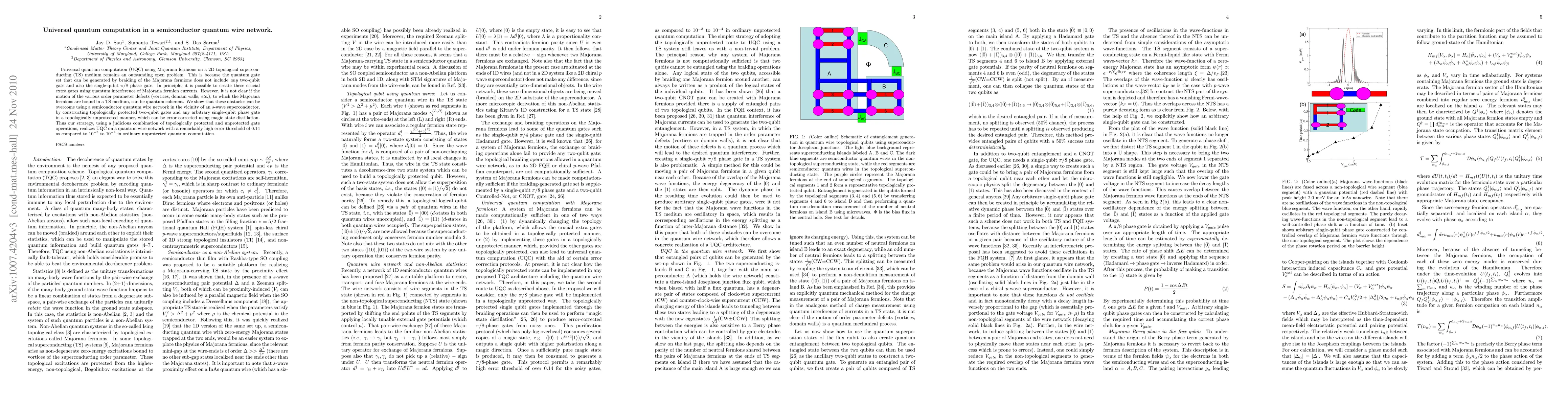 Universal quantum computation (UQC) using Majorana fermions on a 2D topological superconducting (TS) medium remains an outstanding open problem. This is because the quantum gate set that can be generated by braiding of the Majorana fermions does not include \emph{any} two-qubit gate and also the single-qubit $\pi/8$ phase gate. In principle, it is possible to create these crucial extra gates using quantum interference of Majorana fermion currents. However, it is not clear if the motion of the various order parameter defects (vortices, domain walls, \emph{etc.}), to which the Majorana fermions are bound in a TS medium, can be quantum coherent. We show that these obstacles can be overcome using a semiconductor quantum wire network in the vicinity of an $s$-wave superconductor, by constructing topologically protected two-qubit gates and any arbitrary single-qubit phase gate in a topologically unprotected manner, which can be error corrected using magic state distillation. Thus our strategy, using a judicious combination of topologically protected and unprotected gate operations, realizes UQC on a quantum wire network with a remarkably high error threshold of $0.14$ as compared to $10^{-3}$ to $10^{-4}$ in ordinary unprotected quantum computation.