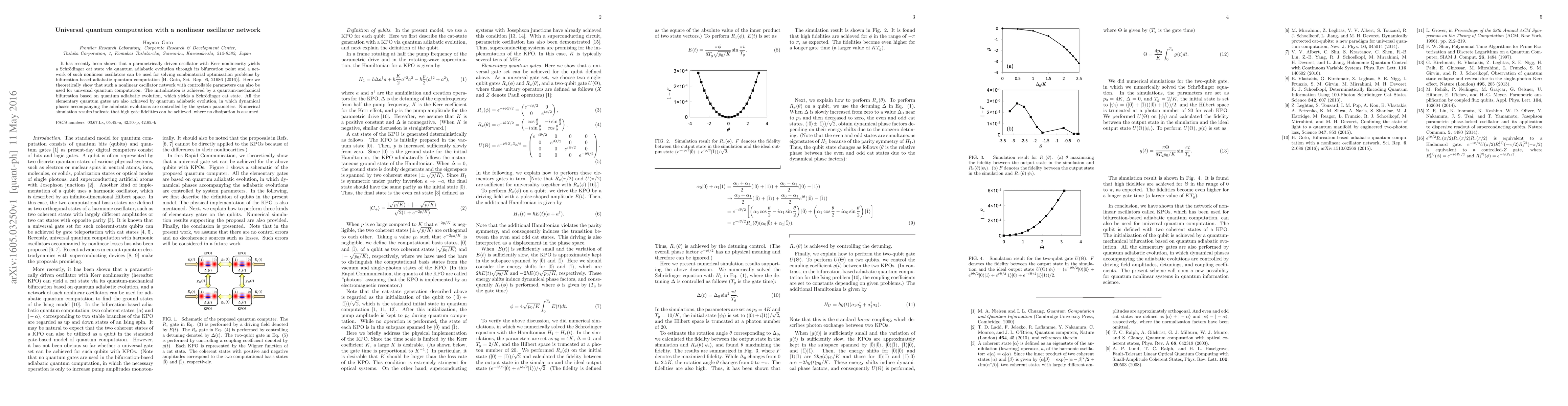 This paper demonstrates that a network of parametrically driven nonlinear oscillators with Kerr nonlinearity can be utilized for universal quantum computation. The approach leverages quantum adiabatic evolution and bifurcation-based techniques to achieve quantum gates and initialize quantum states, with numerical simulations suggesting high gate fidelity.