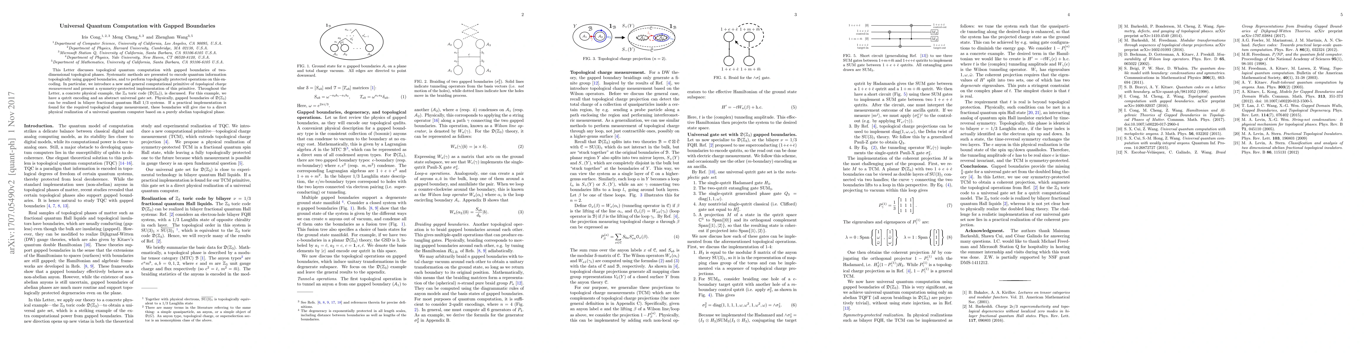 This paper explores universal quantum computation using topological phases with gapped boundaries, introducing a novel topological charge measurement and its symmetry-protected implementation, exemplified by the $\mathbb{Z}_3$ toric code, which may be realized in bilayer fractional quantum Hall systems. If successfully implemented, this approach could yield a practical universal quantum computer.