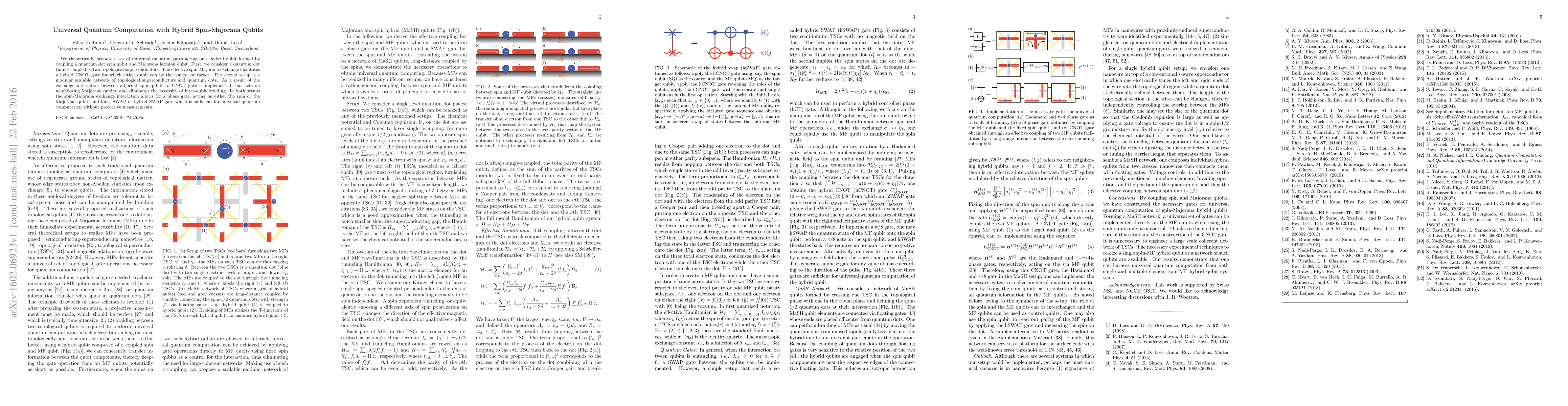 This paper proposes universal quantum gates for hybrid spin-Majorana qubits formed by coupling a quantum dot spin qubit and a Majorana fermion qubit, enabling universal quantum computation without projective measurements. The approach uses spin-Majorana exchange interactions in various setups, including scalable modular networks, to implement CNOT, phase, and SWAP gates.