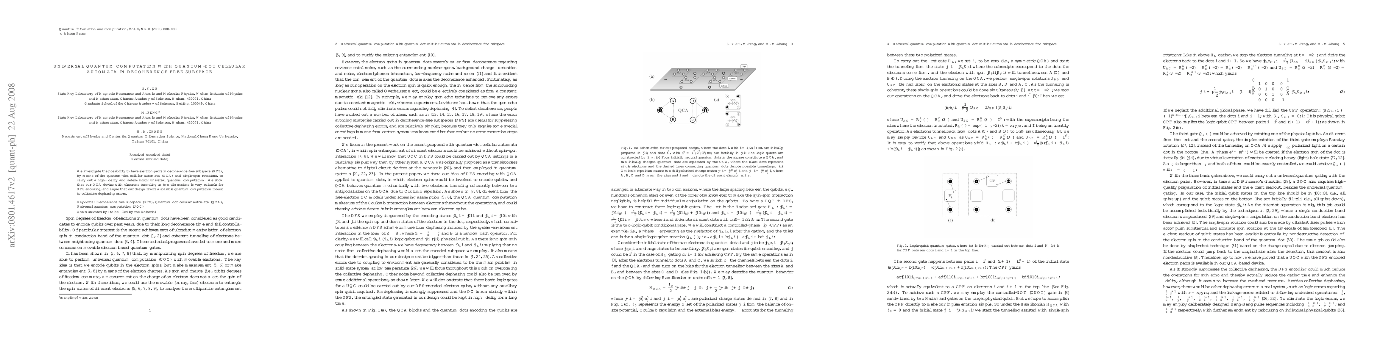 We investigate the possibility to have electron-pairs in dephasing-free subspace (DFS), by means of the quantum-dot cellular automata (QCA) and single-spin rotations, to carry out a high-fidelity and deterministic universal quantum computation. We show that our QCA device with electrons tunneling two dimensionally is very suitable for DFS encoding, and argue that our design favors a scalable quantum computation robust to collective dephasing errors.