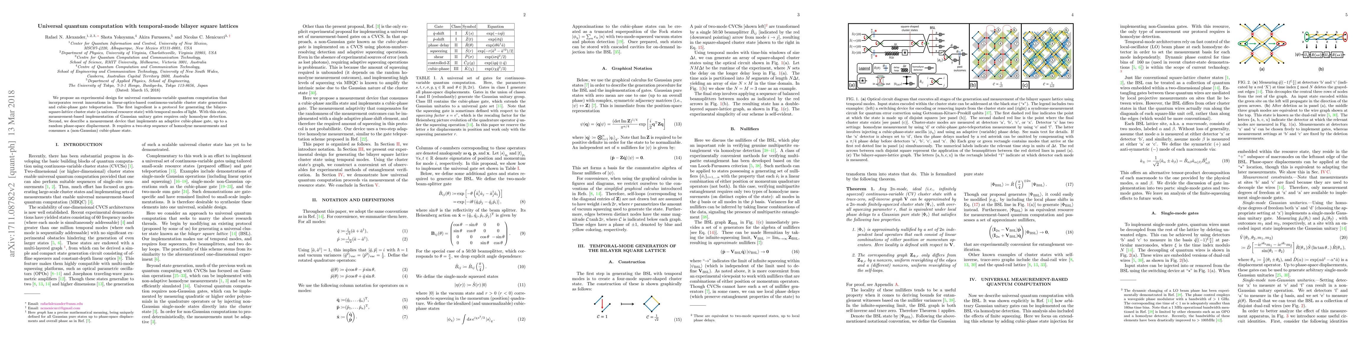 We propose an experimental design for universal continuous-variable quantum computation that incorporates recent innovations in linear-optics-based continuous-variable cluster state generation and cubic-phase gate teleportation. The first ingredient is a protocol for generating the bilayer-square-lattice cluster state (a universal resource state) with temporal modes of light. With this state, measurement-based implementation of Gaussian unitary gates requires only homodyne detection. Second, we describe a measurement device that implements an adaptive cubic-phase gate, up to a random phase-space displacement. It requires a two-step sequence of homodyne measurements and consumes a (non-Gaussian) cubic-phase state.