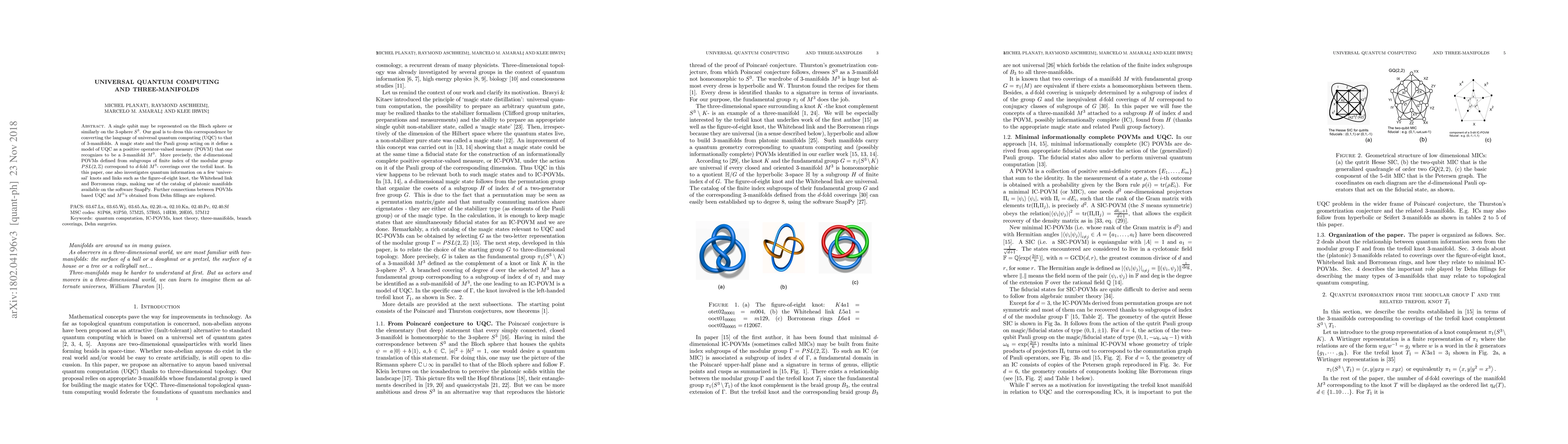 A single qubit may be represented on the Bloch sphere or similarly on the $3$-sphere $S^3$. Our goal is to dress this correspondence by converting the language of universal quantum computing (UQC) to that of $3$-manifolds. A magic state and the Pauli group acting on it define a model of UQC as a positive operator-valued measure (POVM) that one recognizes to be a $3$-manifold $M^3$. More precisely, the $d$-dimensional POVMs defined from subgroups of finite index of the modular group $PSL(2,\mathbb{Z})$ correspond to $d$-fold $M^3$- coverings over the trefoil knot. In this paper, one also investigates quantum information on a few "universal" knots and links such as the figure-of-eight knot, the Whitehead link and Borromean rings, making use of the catalog of platonic manifolds available on the software SnapPy. Further connections between POVMs based UQC and $M^3$'s obtained from Dehn fillings are explored.