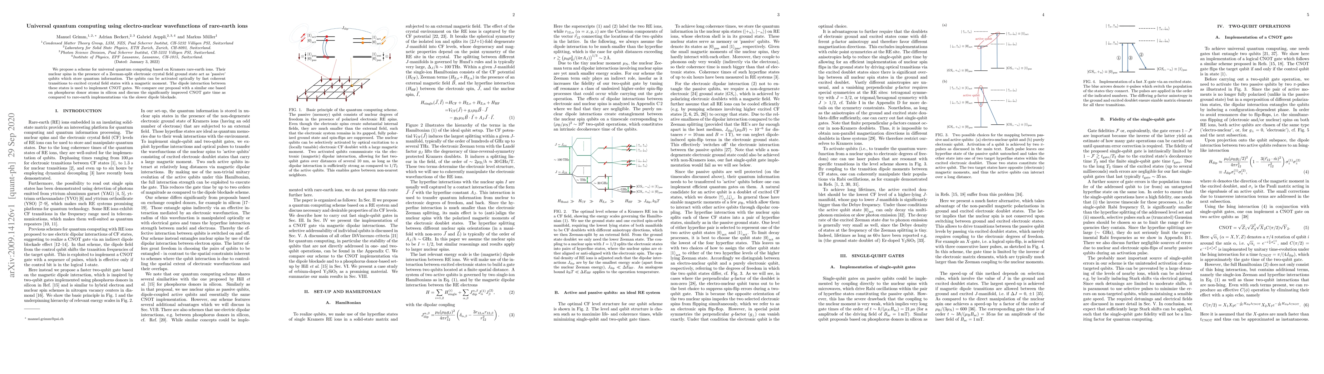 This paper proposes a universal quantum computing scheme using the nuclear spins of Kramers rare-earth ions as qubits, activated optically and manipulated via dipole interactions for CNOT gates. It compares this approach favorably against silicon-based phosphorus donor atoms, highlighting faster CNOT gate times.