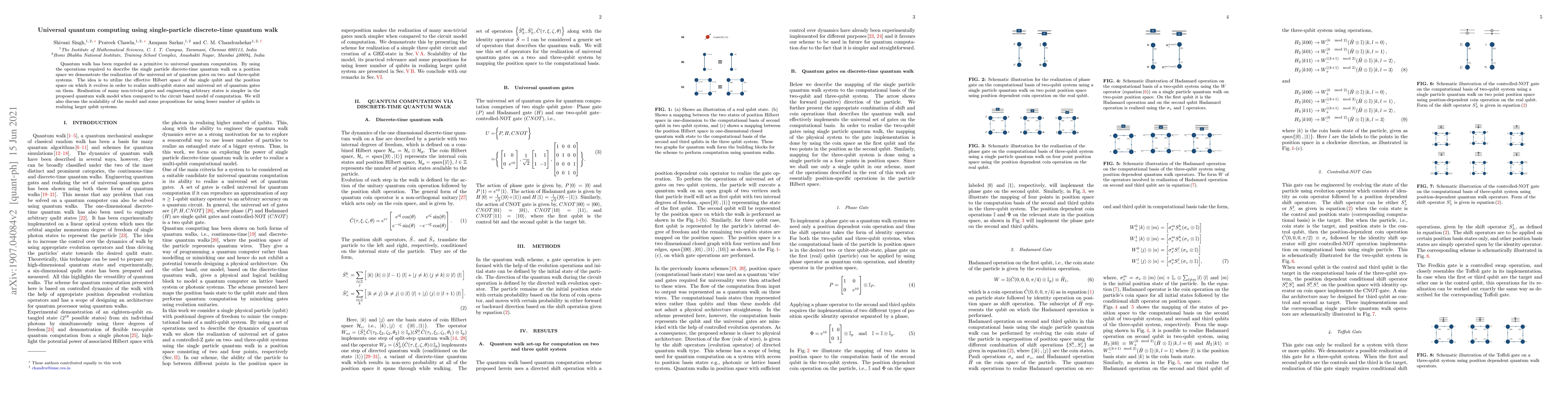 This paper demonstrates the realization of universal quantum computation using a single-particle discrete-time quantum walk, showing that the operations required for this walk can implement a universal set of quantum gates on two- and three-qubit systems. The proposed model simplifies the realization of many non-trivial gates and arbitrary states compared to circuit-based models.