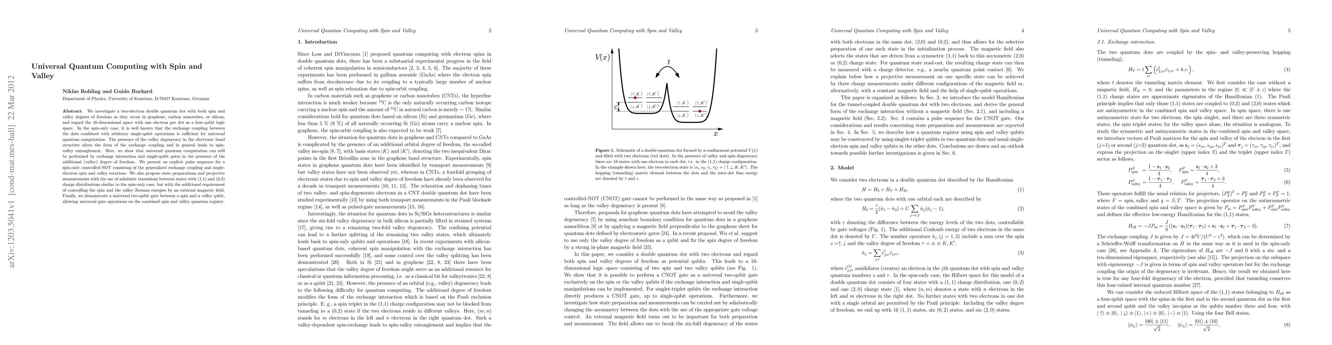 We investigate a two-electron double quantum dot with both spin and valley degrees of freedom as they occur in graphene, carbon nanotubes, or silicon, and regard the 16-dimensional space with one electron per dot as a four-qubit logic space. In the spin-only case, it is well known that the exchange coupling between the dots combined with arbitrary single-qubit operations is sufficient for universal quantum computation. The presence of the valley degeneracy in the electronic band structure alters the form of the exchange coupling and in general leads to spin-valley entanglement. Here, we show that universal quantum computation can still be performed by exchange interaction and single-qubit gates in the presence of the additional (valley) degree of freedom. We present an explicit pulse sequence for a spin-only controlled-NOT consisting of the generalized exchange coupling and single-electron spin and valley rotations. We also propose state preparations and projective measurements with the use of adiabatic transitions between states with (1,1) and (0,2) charge distributions similar to the spin-only case, but with the additional requirement of controlling the spin and the valley Zeeman energies by an external magnetic field. Finally, we demonstrate a universal two-qubit gate between a spin and a valley qubit, allowing universal gate operations on the combined spin and valley quantum register.