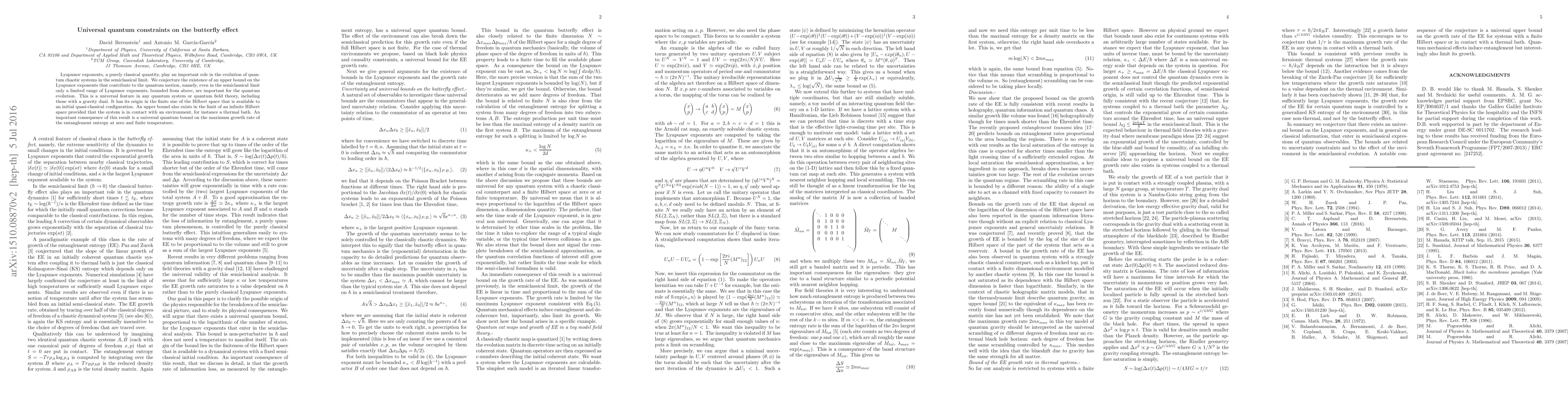 Lyapunov exponents, a purely classical quantity, play an important role in the evolution of quantum chaotic systems in the semiclassical limit. We conjecture the existence of an upper bound on the Lyapunov exponents that contribute to the quantum motion, namely, even in the semiclassical limit only a limited range of Lyapunov exponents, bounded from above, are important for the quantum evolution. This is a universal feature in any quantum system or quantum field theory, including those with a gravity dual. It has its origin in the finite size of the Hilbert space that is available to an initial quasi-classical configuration. An upper bound also exists in the limit of an infinite Hilbert space provided that the system is in contact with an environment, for instance a thermal bath. An important consequence of this result is a universal quantum bound on the maximum growth rate of the entanglement entropy at zero and finite temperature.
