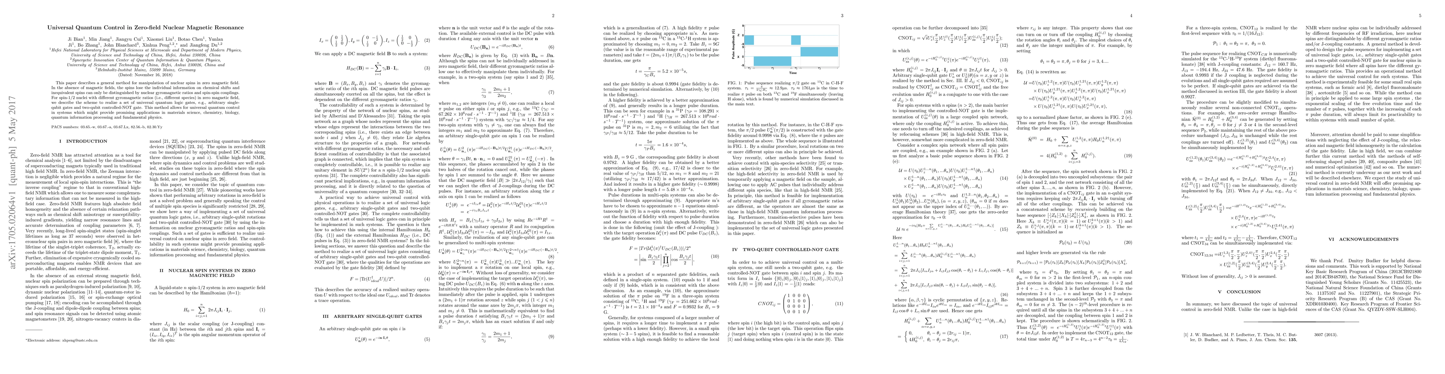 This paper presents a universal quantum control method for manipulating nuclear spins in zero magnetic field, enabling arbitrary single-qubit and two-qubit gates through nuclear gyromagnetic ratios and spin-spin couplings, with potential applications in various scientific fields.